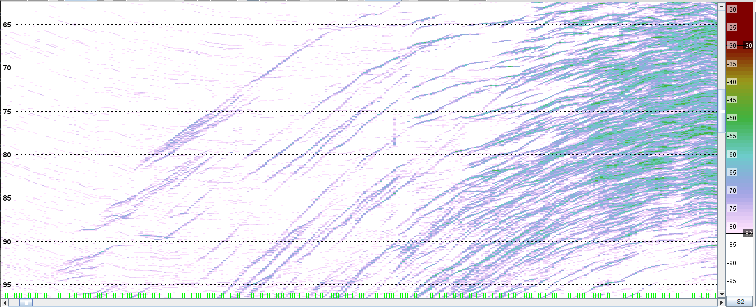 Figure 15. Mackerel in more dense aggregations during daytime. In the left of the echogram it is possible to observe the noise from the Kaijo sonar, as yellow to green vertical lines. On the right half of the echogram Kaijo sonar was stopped and clean data obtained (threshold to -65 dB).
