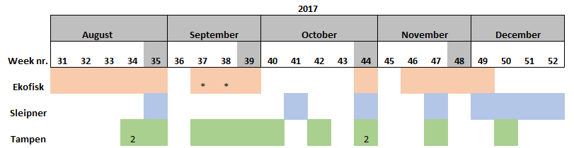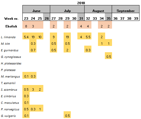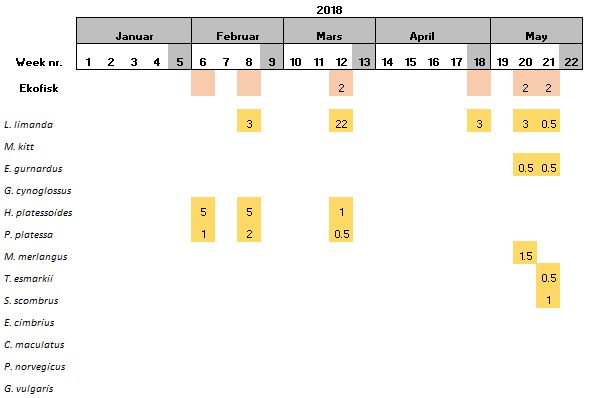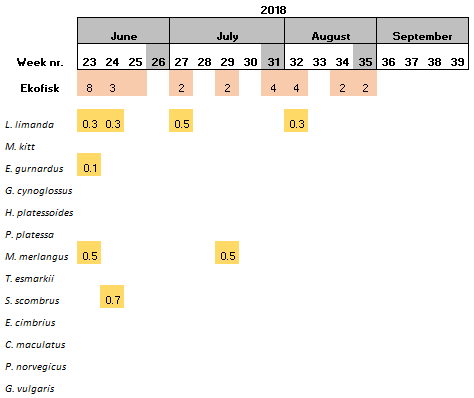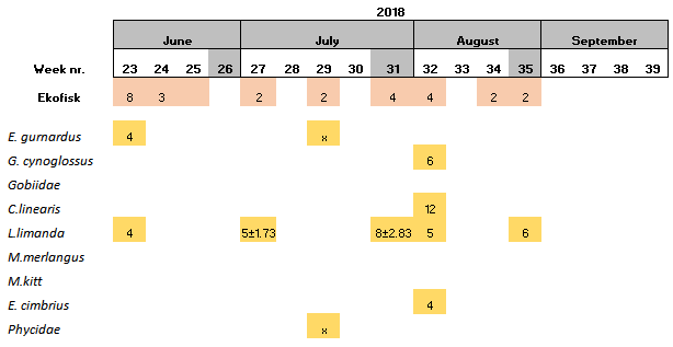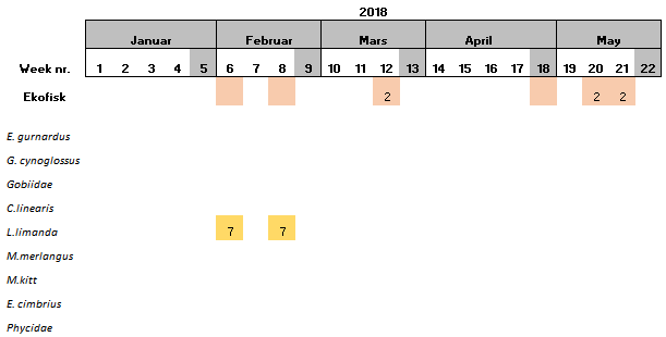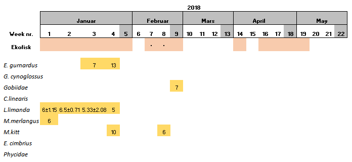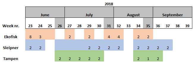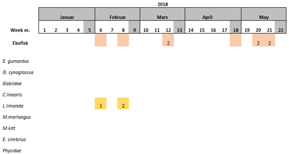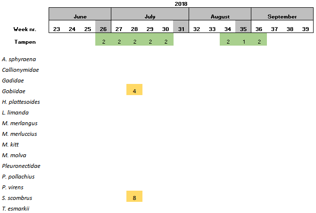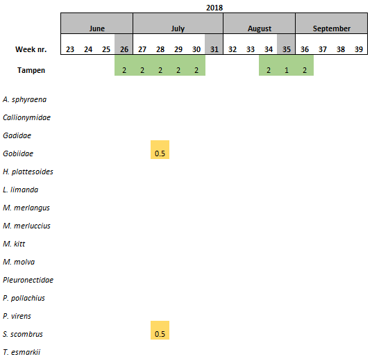 During the start period of the project, samples were collected once per sampling site per week, however it was observed that the amount of eggs and larvae in the samples was low. Consequently, in June 2018, it was decided that the samples should be collected twice per week per sampling site. The results showed that the numbers of eggs and larvae increased slightly, although still low in numbers. Furthermore, there have also been periods were the vessels have not been able to perform sampling due to i) bad weather conditions, ii) technical problems and/or iii) vessel location was outside of the 5 nautical miles from station mid-point required for this study.