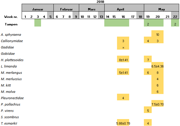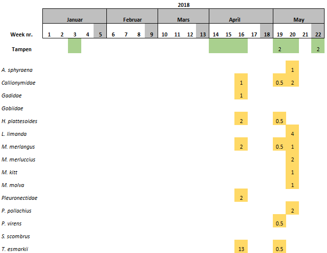 The largest larvae found at Tampen was a Dab individual collected in May 2018 with 13 cm, followed by the single Silver fish collected at Tampen with 10 cm, also in May 2018 (Table 9).