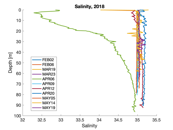 In addition, we have experienced some issues with the CTD data collection. From the 129 samples collected so far, 100 are either data-empty or just contain one measurement point during the depth profile. Only 3 hauls contained complete CTD logging including GPS locations. The reason for this missing data is most likely due to deviations from the sampling procedure, as the CTD unit needs to receive proper satellite fix which takes several minutes after it has been switched on before deployment into water, it also needs to stay in the surface waters for some minutes before the descend (Figure 7).