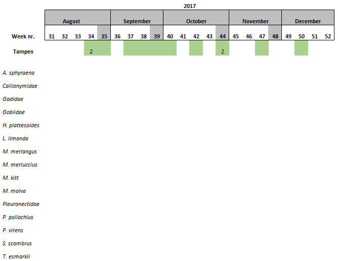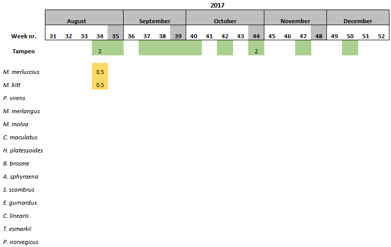 Table 16. Fish larvae identified at Tampen using the molecular approach. Larval numbers are adjusted to the number of samples collected that specific week.