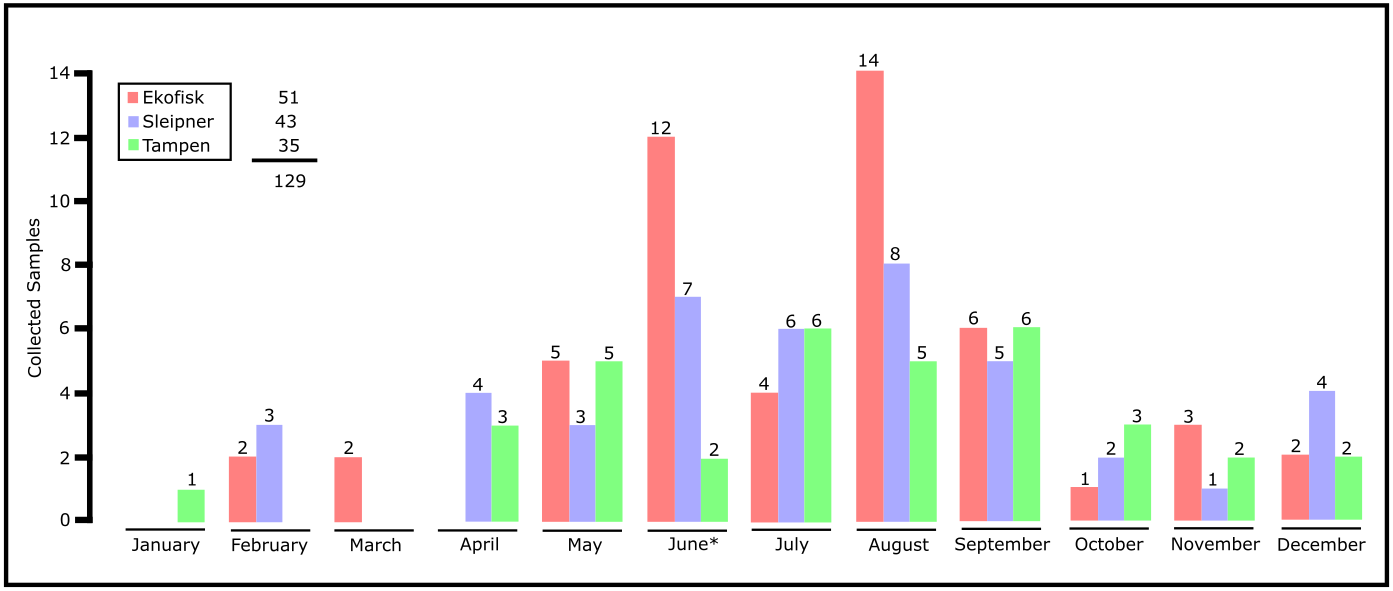 From samples collected from August 2017 to September 2018, a total of 129 samples have been collected and analysed (Table 2). At Ekofisk, the southernmost location, a total of 51 different samples were collected, 43 samples were collected at Sleipner, while 35 samples were collected at Tampen.