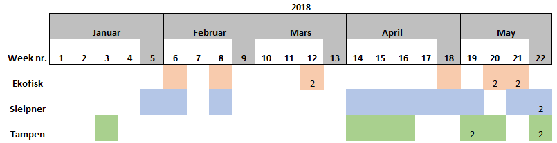The project KINO-1 (“Dynamic Mapping of North Sea Spawning”) collected historic information from various databases about fish species spawning time in the North Sea (Sundby et al., 2017). The project further describes a clear requirement for detailed information including recent data from this dynamic and complex environment. Preparations including providing sampling equipment and the training of crew onboard supply vessels for sample collection procedures of fish eggs and larvae were given by IMR personnel during spring 2017. The collection of samples from the supply vessels for the KINO-2 project started in August 2017, and the financing and official initiation of KINO-2, started 1. May 2018. KINO-2 aim at improving knowledge on spawning areas and timing for the main fish species reproducing in the North Sea.