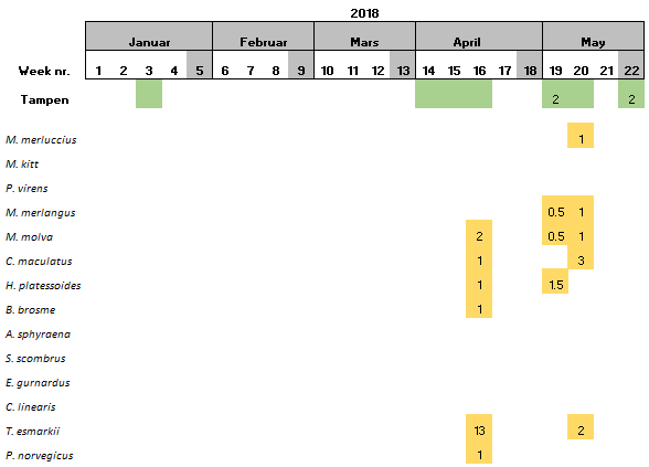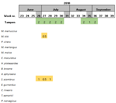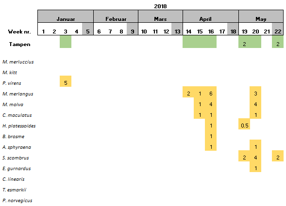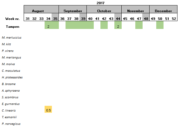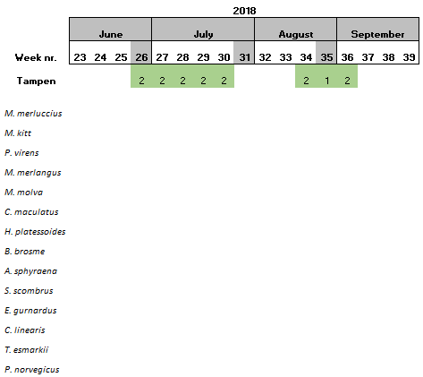 At the northernmost location, Tampen, 15 species were found. Saithe and Pollack were only detected at this sampling site (Table 8).