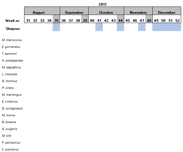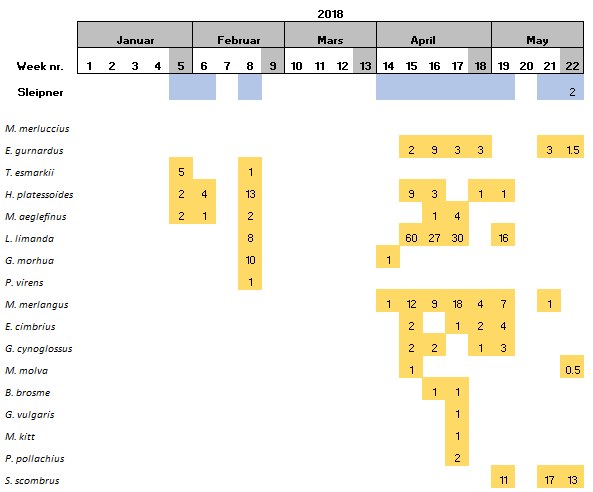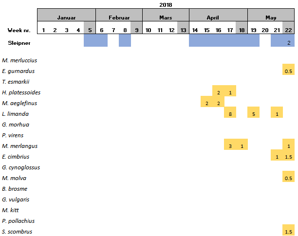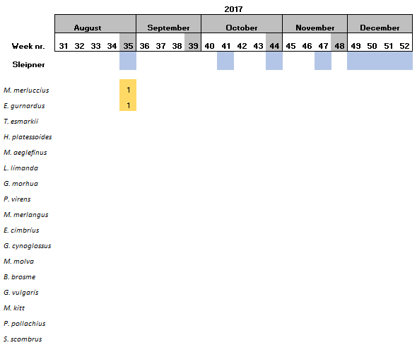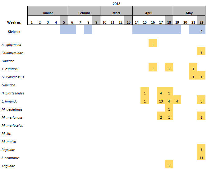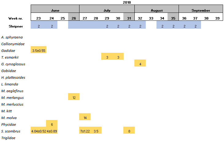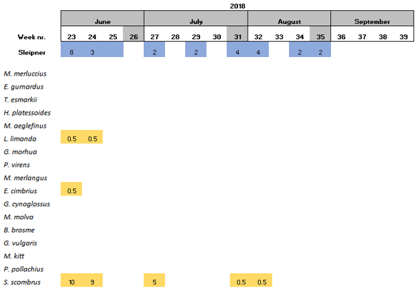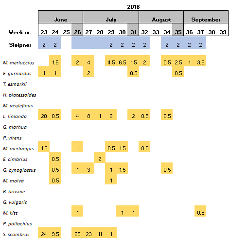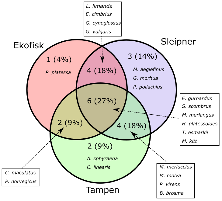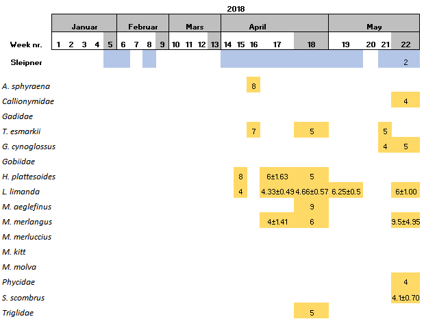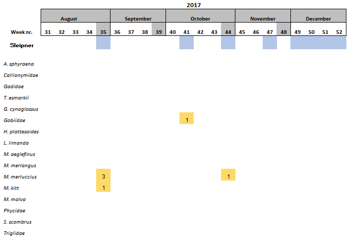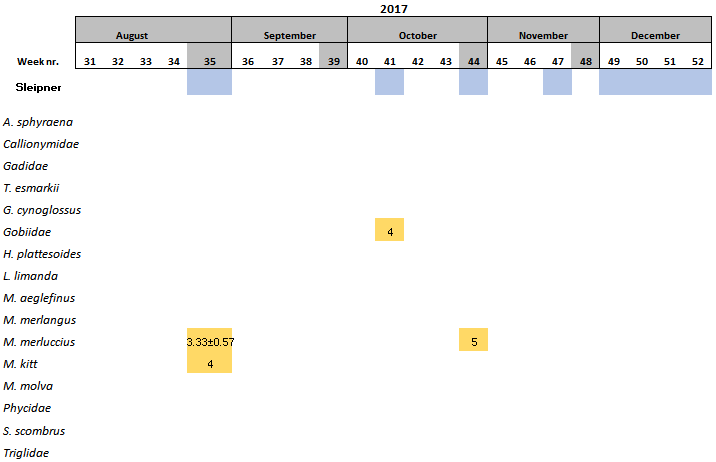 Within the 16 species found at Sleipner, Haddock and the family Triglidae (family level) have been only found at this location (Table 6).