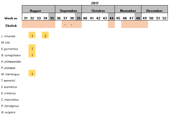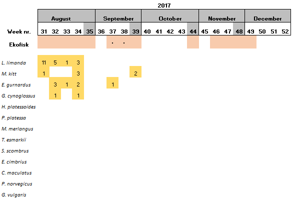 Table 2. Distribution of the samples collected per week. Asterisk indicates samples where the date has not been included in the sampling protocol. A number inside a cell indicates the number of hauls collected per week if more than one. Absence of colour indicates weeks where sampling was not conducted.