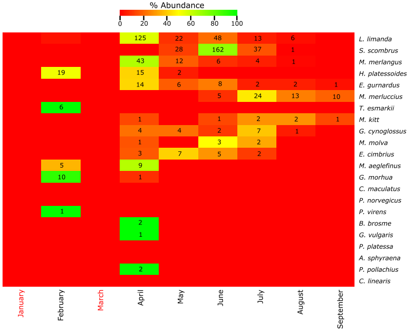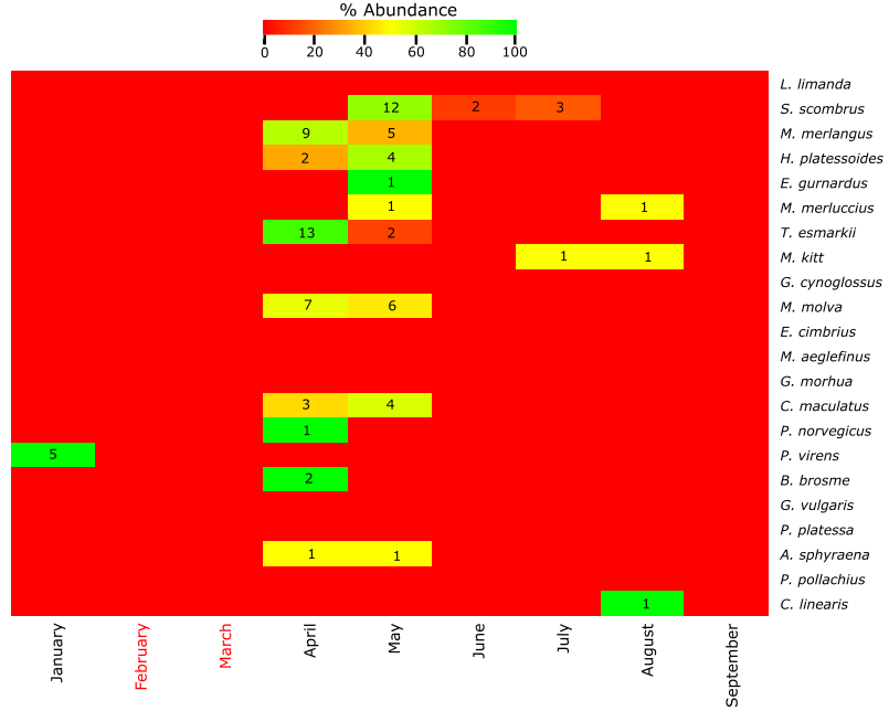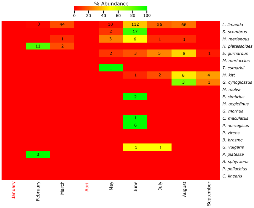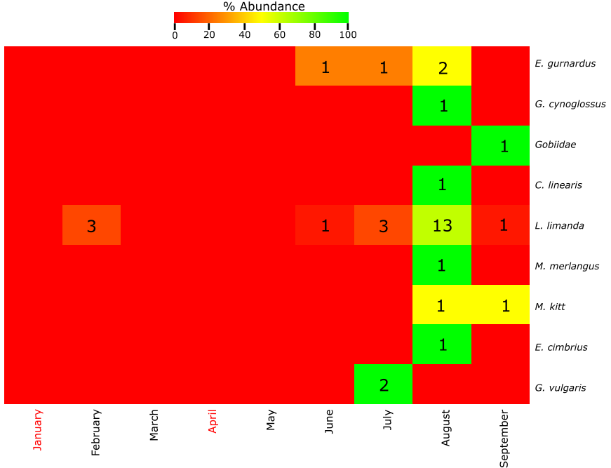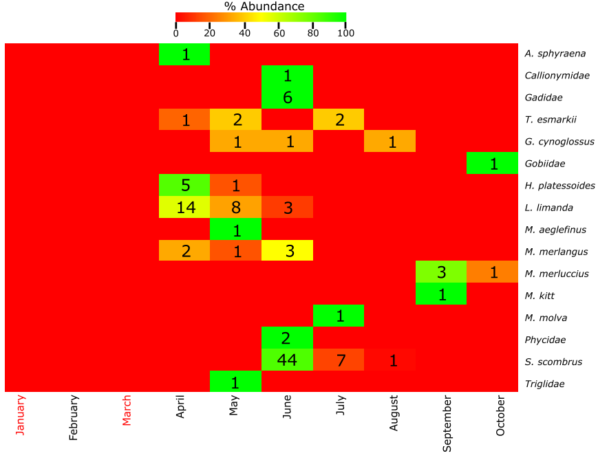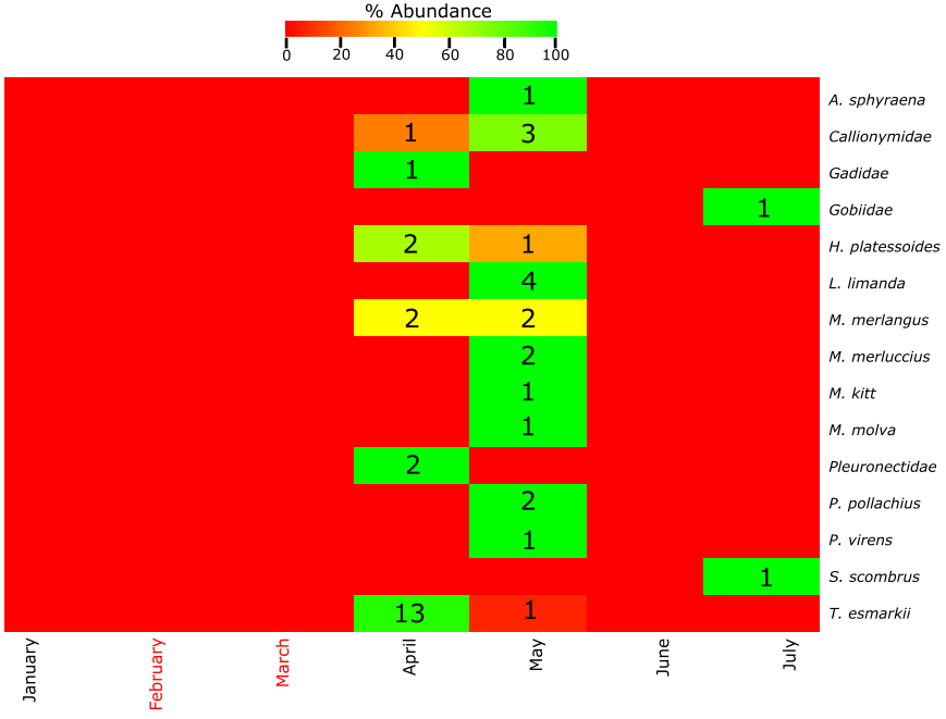Figure A6. Top: Heatmap of the % abundance of the fish species found at Ekofisk using the molecular approach. The total number of individuals from each species per month of the year is indicated with a number within the figure. Months with no samples collected are indicated with red color. Months between October and December are not included due to the absence of eggs and larvae in the samples. Bottom: Table of the presence (yellow) or absence (white) of the fish species. Months where samples have not been collected are indicated with grey color while red color indicates fish species not found at this location.
