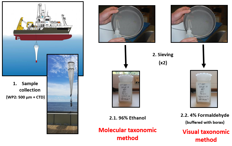 Each sample was sequentially poured from the cod-end through a 180 μm meshed sieve and transferred into a 100 mL square plastic bottle (Figure 3) for fixation. The first haul was preserved in 96% ethanol for the molecular taxonomic analyses, whereas a second haul was preserved in seawater borax buffered 4% formalin concentration for on shore visual taxonomic identification (Figure 3).