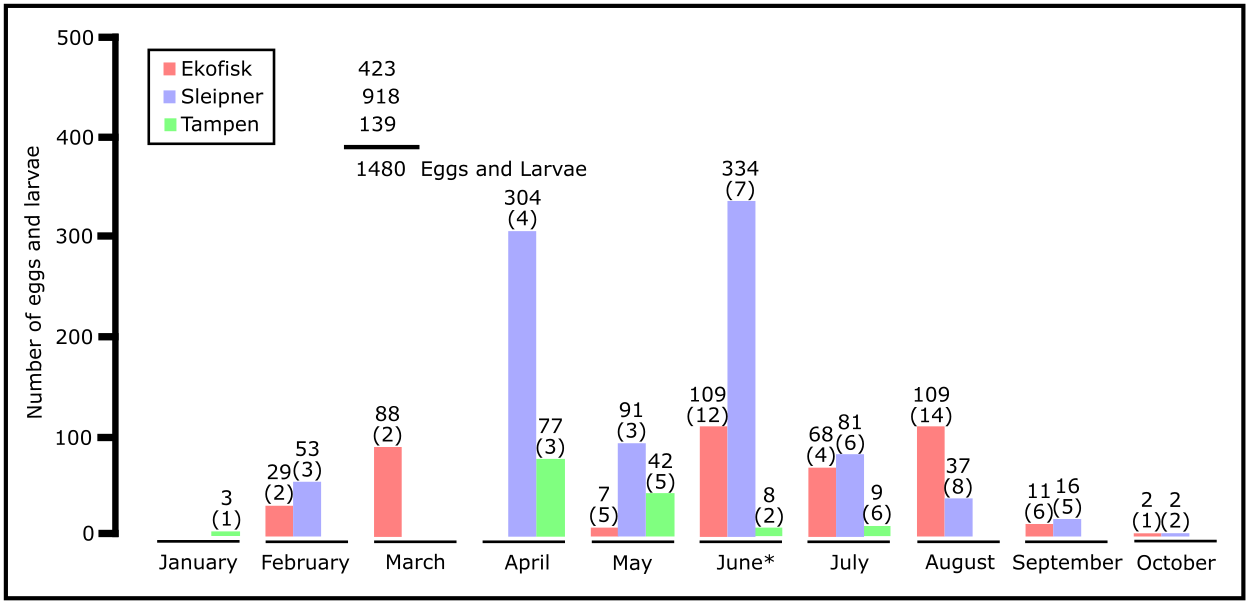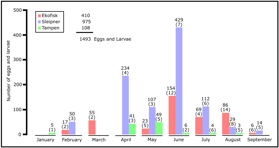 For the visual taxonomic method, total of 1480 individuals have been analysed, consisting of 1285 fish eggs and 195 larvae. At Ekofisk, the southernmost location, there was a total of 423 individuals (386 eggs and 37 larvae), 918 individuals (802 eggs and 116 larvae) at Sleipner and 139 individuals (97 eggs and 42 larvae) at Tampen (Figure 4). No eggs or larvae have been found in samples from November and December.