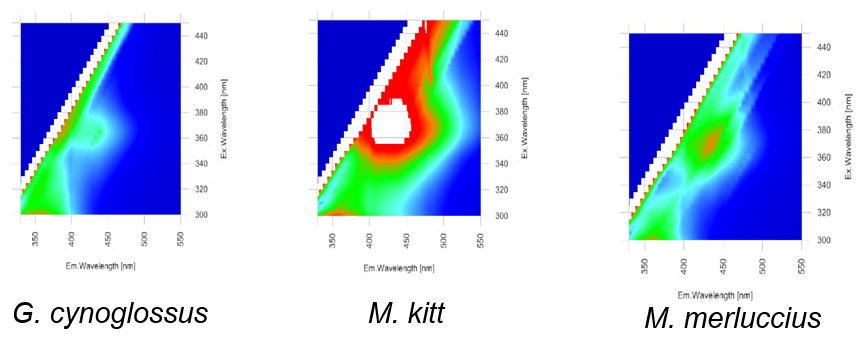 We also plan to explore other ways to improve the methodology. One test will be to use 1% formaldehyde to preserve the samples, as suggested by Lelievre et al. (2010). If successful, this method will allow to perform both molecular and taxonomic analyses using the same eggs. In addition, we currently also test the potential of using fluorescence to identify fish species. Although this technique has never been applied on fish eggs before, will be tested during the next part of the project. In fact, we have so far tested 9 different eggs that belonged to three different species (G. cynoglossus, M. kitt and M. merluccius) and displayed 3 different fluorescent patterns (Figure 9). Although those results are promising, further work including more species need to be performed.