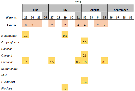 Table 13. Fish eggs identified at Sleipner using the molecular approach. Egg numbers are adjusted to the number of samples collected that specific week.