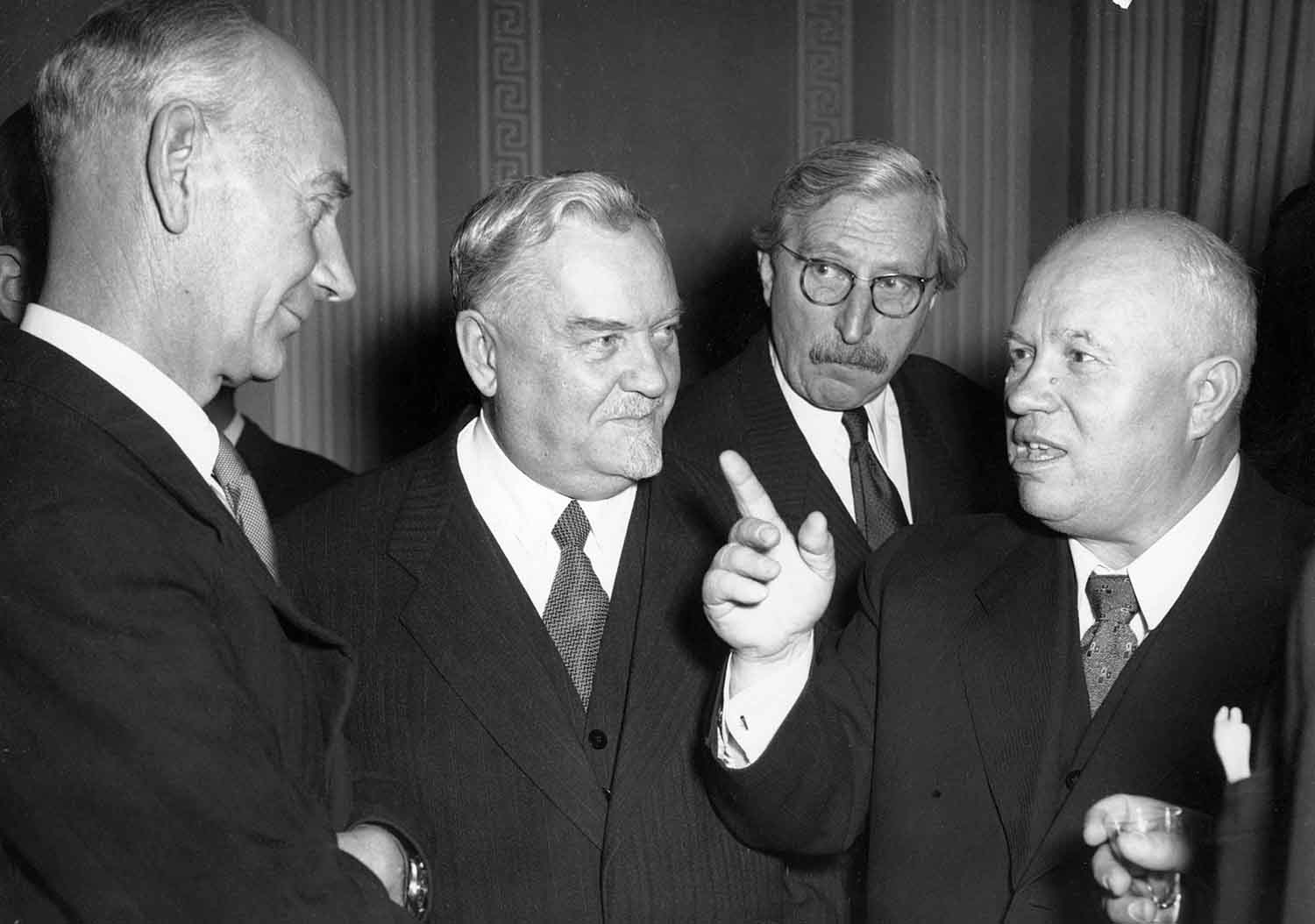 Prime minister Einar Gerhardsen (left) proposed marine research as a field of cooperation between Norway and the Soviet Union. He met the leader of the Soviet Union, Nikita Khrushchev (right) in Moscow in November 1955. (Photo: NTB-Scanpix)