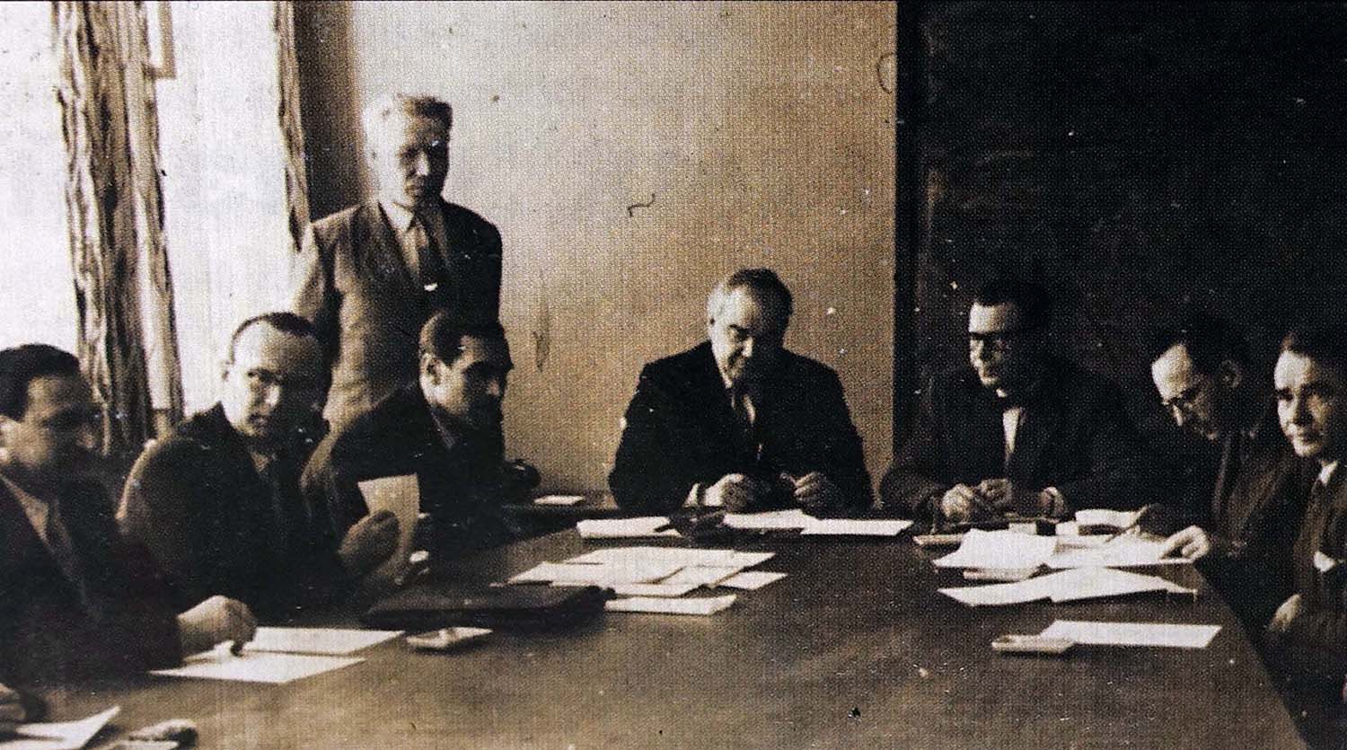Norwegian and Soviet marine scientists met in Bergen in February 1958. To the left we see marine scientist Yuly Yu. Marti and head of IMR, Gunnar Rollefsen. PINRO-director Ivan I. Lagunov (standing) a talk. (Photo: Rybnoye Khosyaystvo)