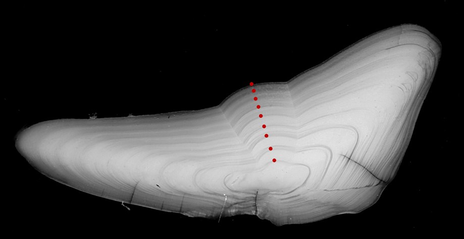 A 9-year old Northeast Arctic cod (“skrei”) sampled in Lofoten, i.e. at the main spawning ground, in 1994. The age is given from the number of winter rings (dots) while the type of stock by the shape of the innermost winter ring. (Photo: Côme Denechaud. Annotation: Côme Denechaud and Jane Aanestad Godiksen, both at IMR, Bergen, Norway.)