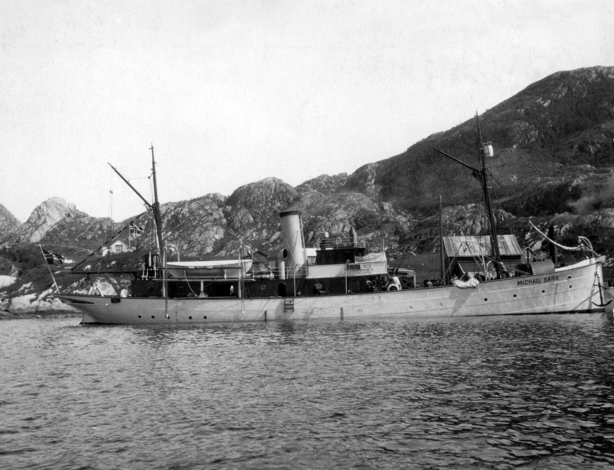 Michael Sars, Norway’s first ship specially dedicated to research, began serving as a research vessel in 1900. Originally an English trawler, this retrofitted ship served as a model for fisheries research vessels in all ICES’ member states. In this photo, she lies at anchor in a fjord somewhere along the Norwegian coast. It is a holiday and flags are flying on board and ashore. (Photo: Institute of Marine Research)