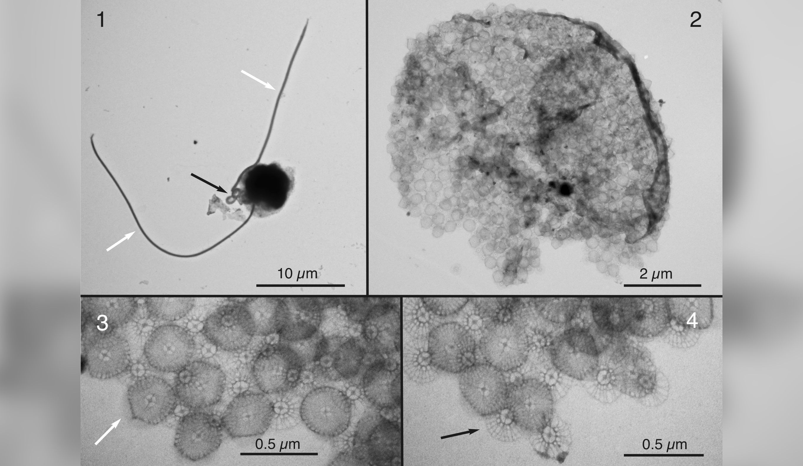 Images of Chrysochromulina leadbeateri. Figure 1 shows the whole alga, while the other images are close-ups of various parts of it. This alga is so small that scientists must use an electron microscope to get close-ups of it.