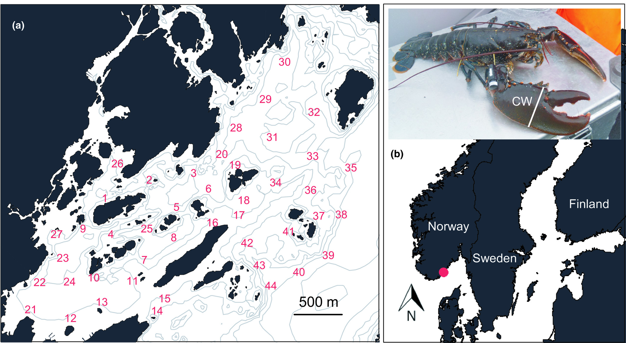 Between Arendal and Grimstad, researchers tagged 100 lobsters with acoustic transmitters. With the help of numerous stationary receivers, they were able to track the lobsters’ movements during the fishing season.