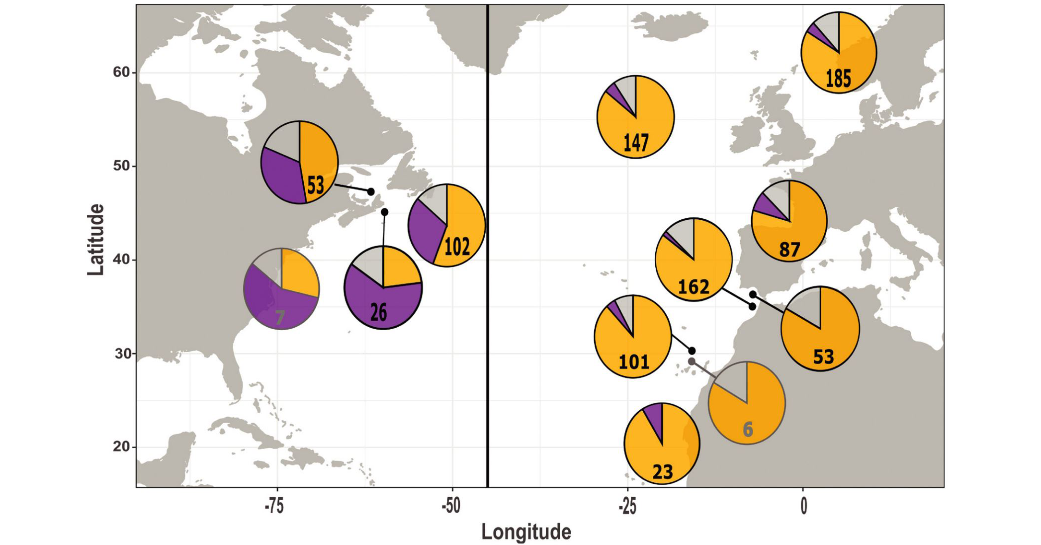 Currently a dividing line is drawn in the middle of the Atlantic at 45 degrees west. For the sake of simplicity, it is assumed that bluefin tuna caught west of this line come from a western population, and that those caught east of it come from the east.