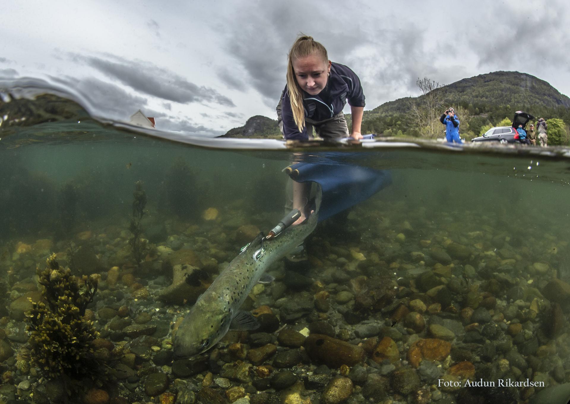 Scientists from UiT, NINA and IMR tagged 16 adult Atlantic salmon with satellite tags in the River Etne in Southern Norway. These were salmon kelts, which means they had spawned the autumn before, lived on meagre resources in the river during the winter, and at the time of tagging in the spring they were heading towards the ocean to feast on the richer food resources there.