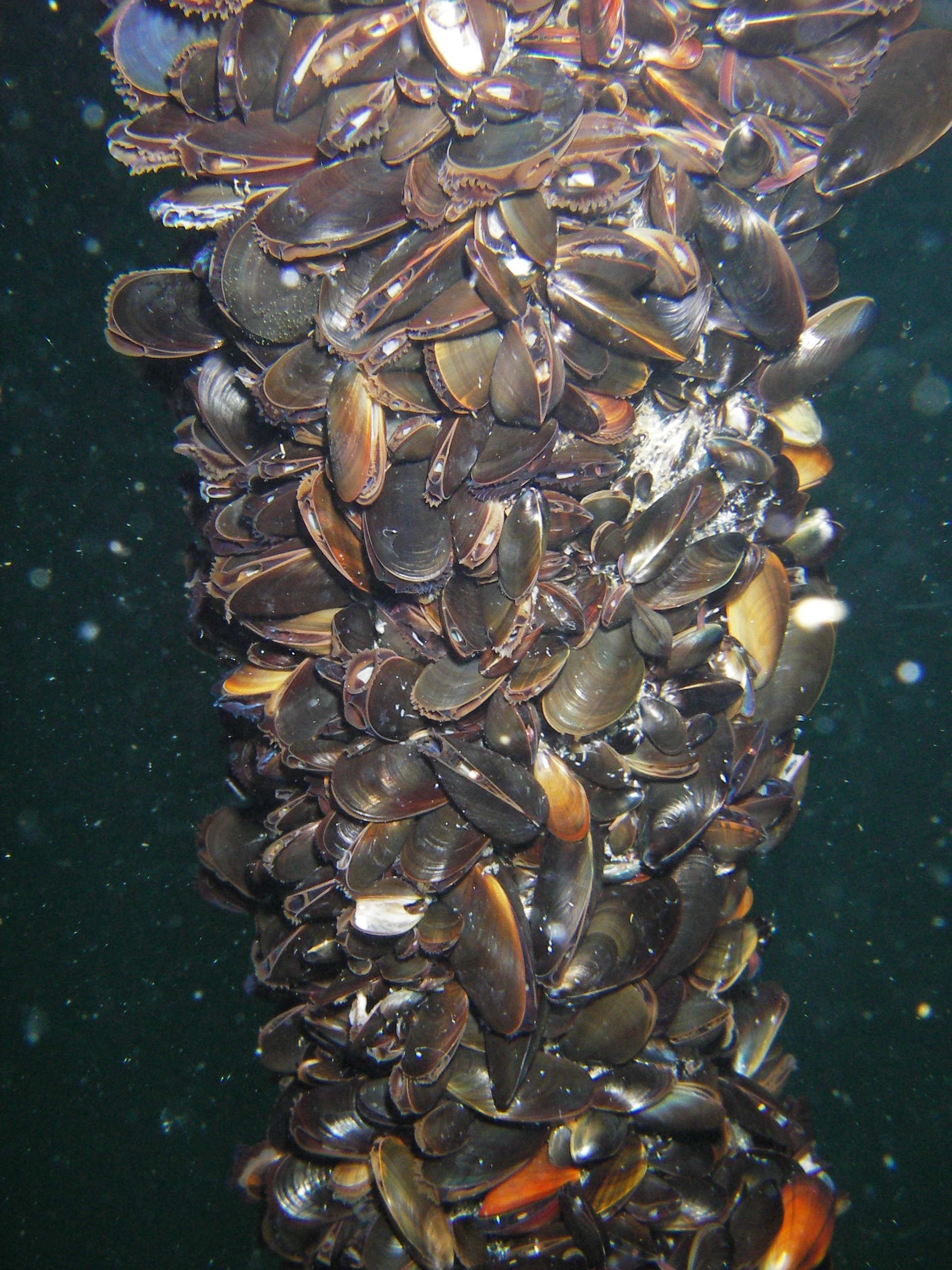 Mussels are efficient consumers of the microalgae found in the ocean, and their nutritional content should be suitable for fish feed.