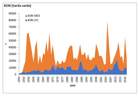 Estimated landings (t) of Atlantic bonito in the Atlantic and Mediterranean, 1950–2017.