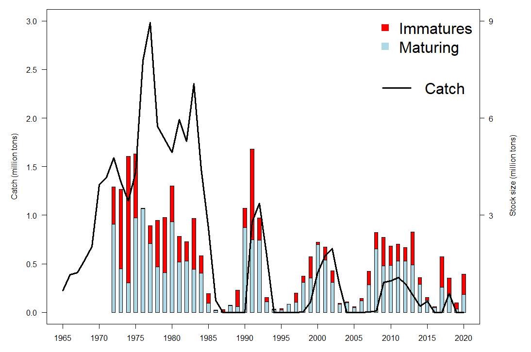 Due to the short life span of capelin and years of recruitment failures, the capelin population is very fluctuating. Four population collapses have been observed since measurements began in 1971. The fishery after capelin is closed during the periods of collapse. During periods of higher populations, fishery is allowed, but the regulations state that the capelin consumption of the cod should be taken into account in the advisory on capelin, and in practice the fishery should only occur on the surplus after the cod has been supplied. I recent years there has been a weak capelin recruitment in addition to a high cod population, so there has only been opening for a fishery in one of the last 5 years.
