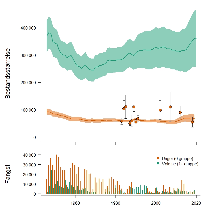Modelled population size of harp seals in the Greenland Sea and catch level 1946–2019: