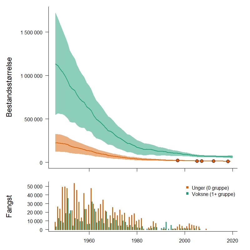 In the traditional Norwegian sealing activities in the Arctic Ocean, hunting bluebacks (hooded seal pups) in the Greenland Sea has been an important component. In the decades leading up to 2005, ICES considered the low catch levels sustainable. The observed decline in pup production, and generally low stock levels over several decades, led ICES to conclude that continued catching may prevent the stock to recover, or in worse case be reduced even further. All hooded seal catches in the Greenland Sea were therefore stopped as of the 2007 season. Exempt from this prohibition is a limited catch for scientific purposes. The joint Norwegian-Russian Fisheries Commission has followed the advice of ICES, which is also in line with the Institute of Marine Research's recommendation. The moratorium on catches will continue in 2020. Historical catches of hooded seals in the Greenland Sea for the years 1946–2019 are given in the figure below, which also shows modelled population trends: