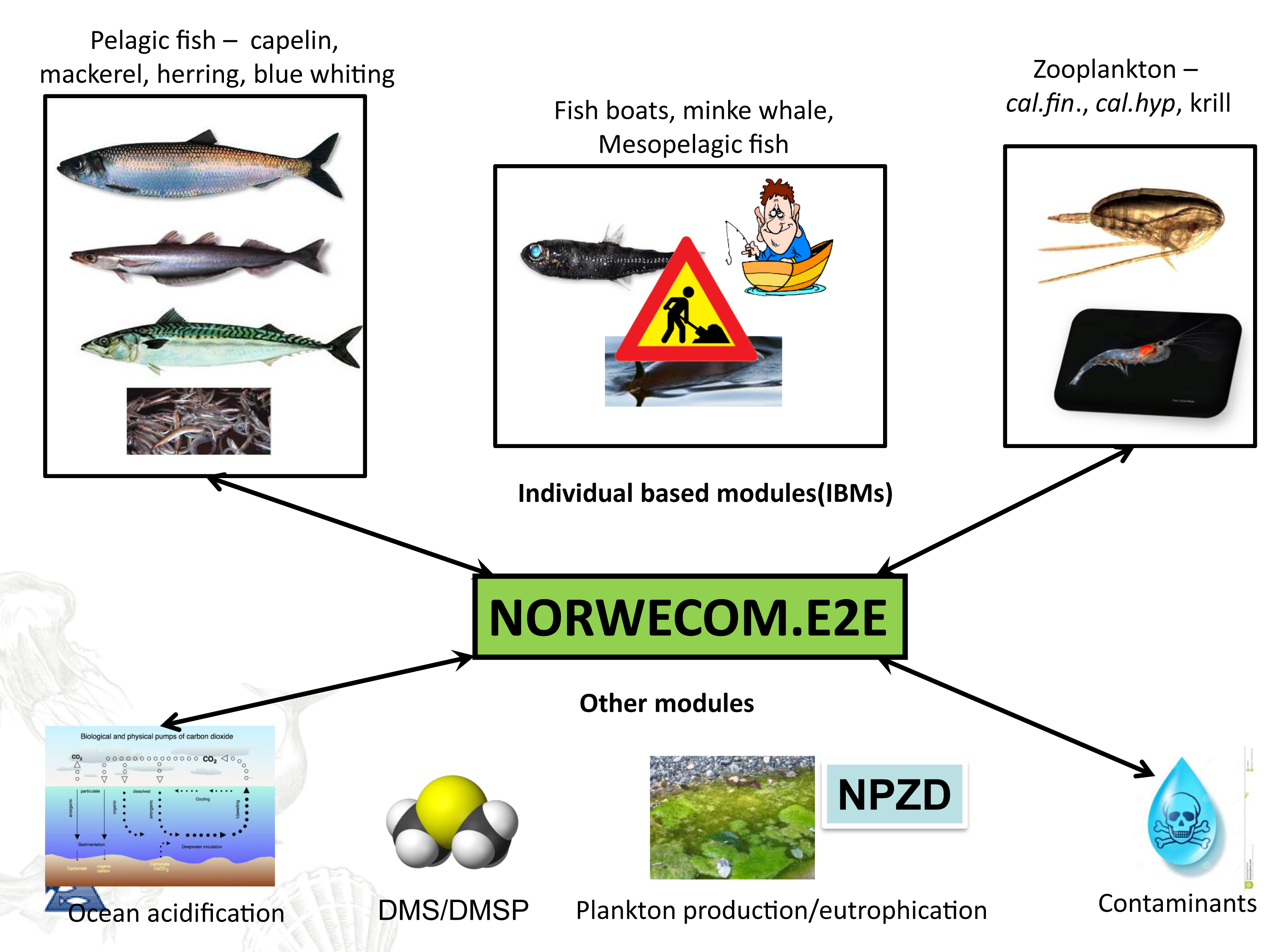 NORWECOM.E2E er satt sammen av flere modeller: en Nutrient-Phytoplankton-Zooplankton-Detritus (NPZD) model for næringssalt og lavere trofiske nivå, samt ulike Individ-Baserte Modeller (IBMs) for zooplankton og fisk. NORWECOM.E2E er en av veldig få modeller i verden hvor IBM´er for ulike tropfiske nivå er to-veis koblet og i stand til å simulere næringsnettdynamikk for et stort havområde, og den eneste slik type modell for norske farvann. Modellen er utviklet på Havforskningsinstituttet, og i 2021inneholder modellen IBM´er for pelagisk fisk (makrell, sild og kolmule), dyreplankton (Calanus finmarchicus, Calanus hyperboreus og Calanus glacialis) samt fiskebåter. Gjennom NORWECOM.E2E er alle disse modellene integrert i et fullt koblet system som bruker drivkrefter fra en havmodell til å beskrive omgivelsenes temperatur og strømmønster. Modellsystemet brukes til å studere naturlige variasjoner og effekter av feks klimaendringer, havforsuring eller fiske i økosystemene våre, men også som et hjelpemiddel for å vurdere overvåkningsstrategier og observasjonsmønster.