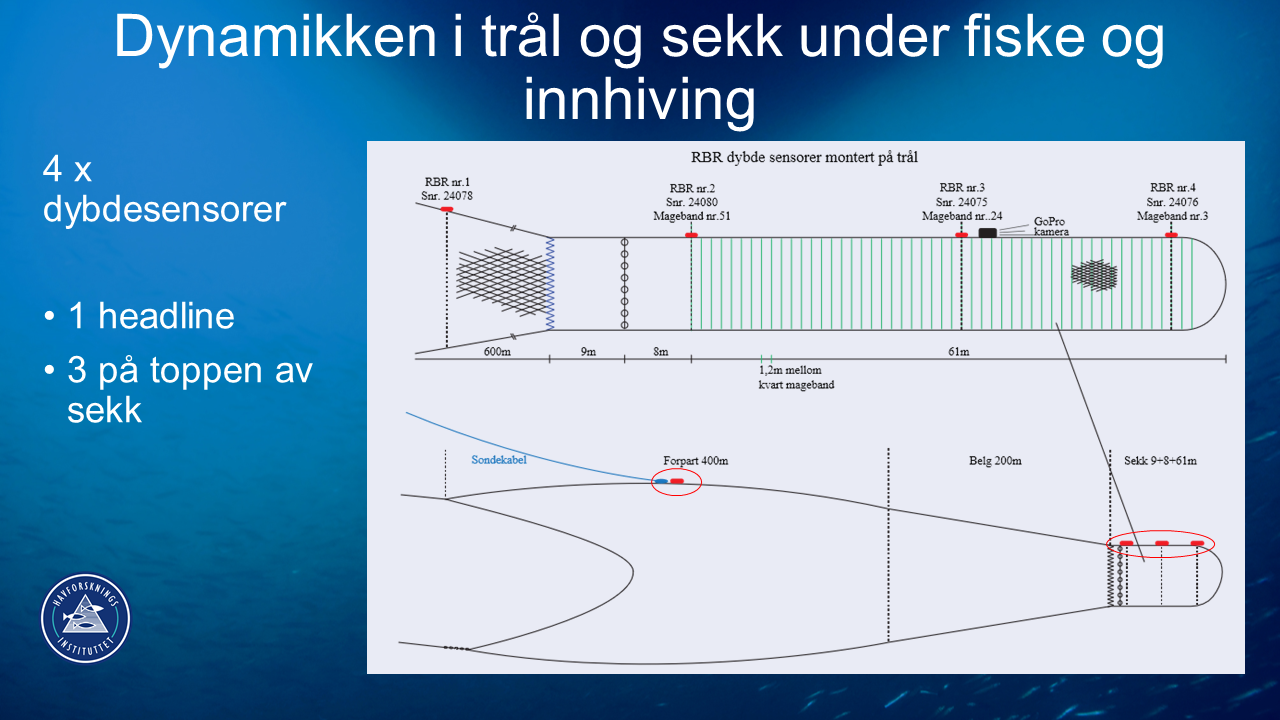 Det ble montert 4 dybdeloggere på trål og sekk for å studere dynamikken og stigningshastighet under innhiving (Figur 1). I tillegg ble det montert et undervannskamera og lampe i dypvanns hus på to trålhal. Et annet videokamera ble montert på akter på fartøyet under innhiving for å dokumentere sekkens atferd når den treffer overflaten. Under en kontroll kalibrering av dybdeloggerne (0-265 m) ble det målt en gjennomsnittlig forskjell i registrert dyp på 0.4 m mellom de dybdeloggerne, med 80 prosent av verdiene < 0.5 m. Dette dokumenterer at registreringen fra dybdeloggerne kan brukes for å estimere trålens vertikal profil. Klokkene på kameraer og dybdeloggerne var synkroniserte slik at alle data kunne sammenlignes i tid.