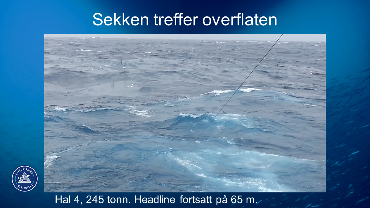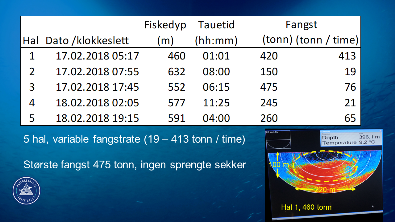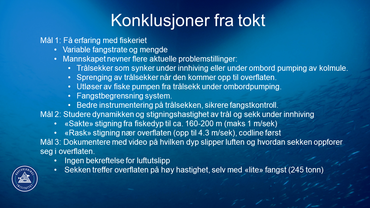 Innsamling av data gikk som planlagt, men med færre tokt og hal enn ønsket. Dynamikken til sekken under fiske og innhiving ble registrert og oppstigningshastighet, orienteringsevne og geometri ble målt og analysert inkludert forhold til fiskedyp og fangstmengde. Punkteringsdyp for svømmeblære ble beregnet for et hal ved bruk av undervannsvideoopptak og tid-synkroniserte dybdesensorer, men replikater vil være nødvendige for å bekrefte resultatene og se på sammenheng mellom fiskedyp og punkteringsdyp. Filming i overflaten bekreftet at sekken treffer overflaten med stor kraft på grunn av oppdriften, men kort dagslys i februar førte til opptak fra bare to hal (innhiving for de andre halene foregikk om natten). Selv om ekkoregistreingene ikke indikerte særlig høye fisketettheter, ble det målt fangstrater på opp til 6.9 tonn/min, men også så lave som 0.3 tonn / minutt bare tre timer senere.