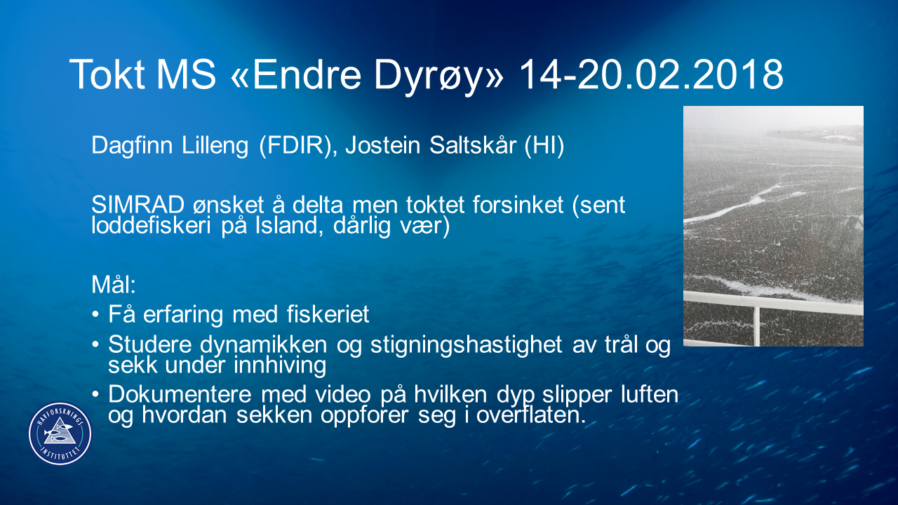 Jostein Saltskår (Havforskningsinstituttet) og Dagfinn Lilleng (Fiskeridirektoratet) ble med på et tokt om bord i MS «Endre Dyrøy» 14-20 februar, 2018. Rederi og mannskap på «Endre Dyrøy» har vært med i diskusjoner siden prosjektet ble lansert og tilbudt plass om bord og stilt redskap til disposisjon for montering av sensorer og kameraer under kommersielt fiske. Vi hadde håpet å gjennomføre to tokt, men en sen oppstart for kolmulefiske på grunn av forlenget fiske av lodde ved Island og dårlig vær førte til kun en tur med fem trålhal og en samlet fangst på 1 550 tonn.