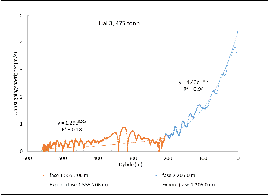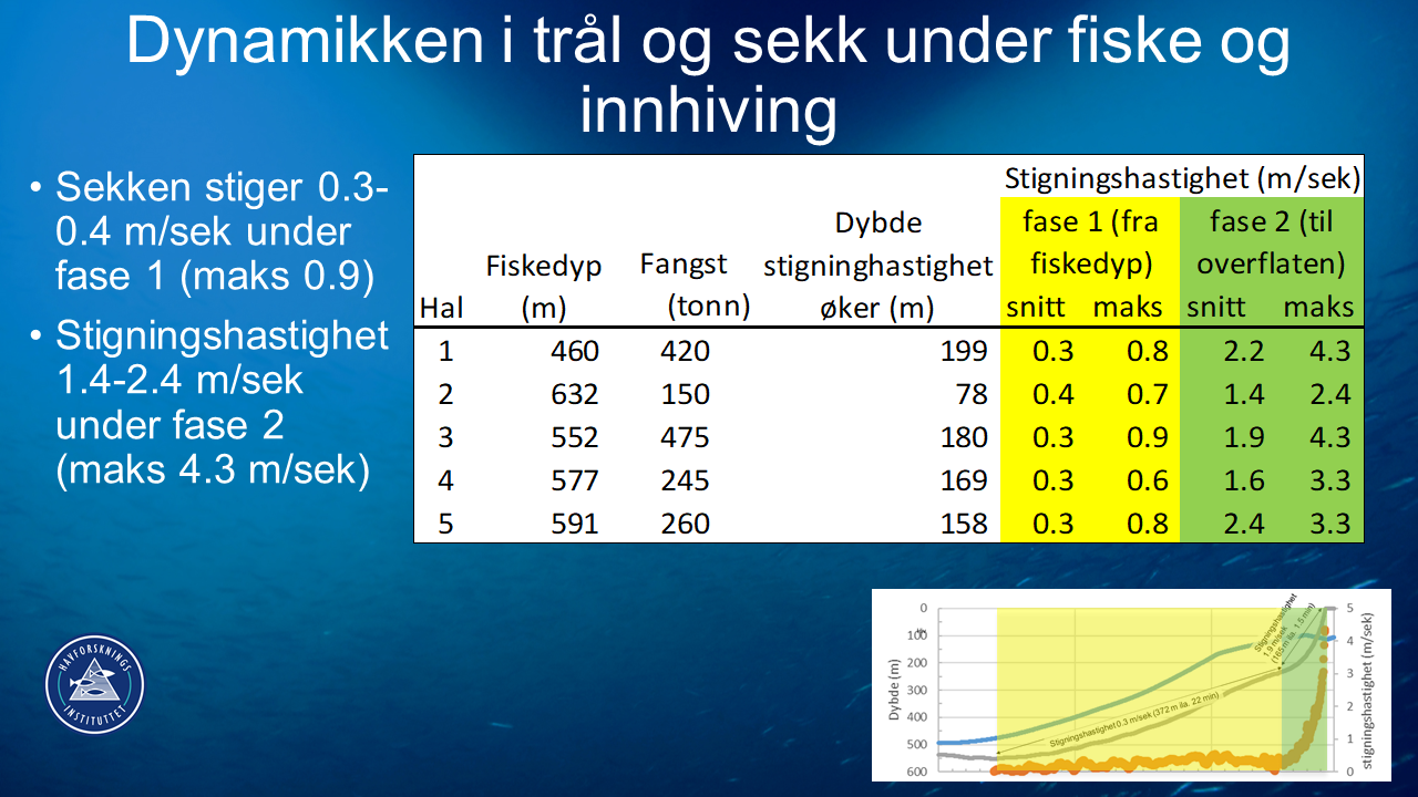Dybdesensordata viste at oppstigningshastigheten er relativt konstant (og lav) under den første delen av innhivingen («fase 1»), men øker kraftig når sekken nærmer seg overflaten («fase 2», Tabell 1; Figur 2). Det finnes intet klart forhold mellom oppstigningshastigheten og dypet under fase 1, men oppstigningshastigheten øker eksponentielt med avtagende dyp under fase 2.