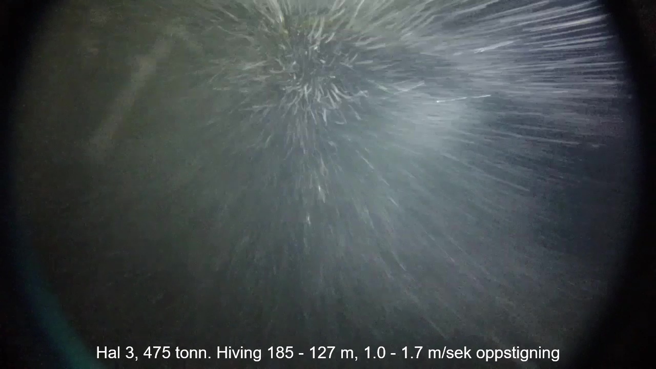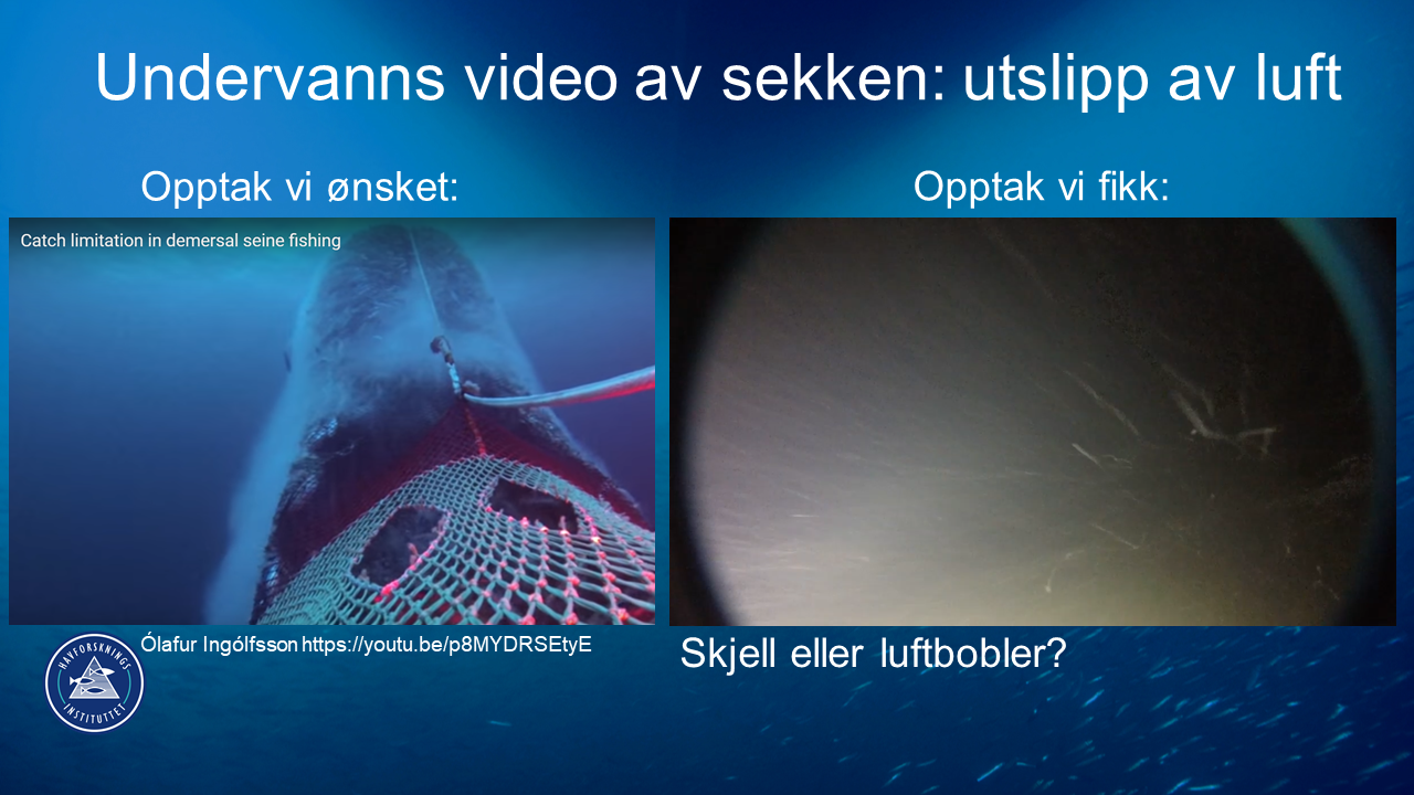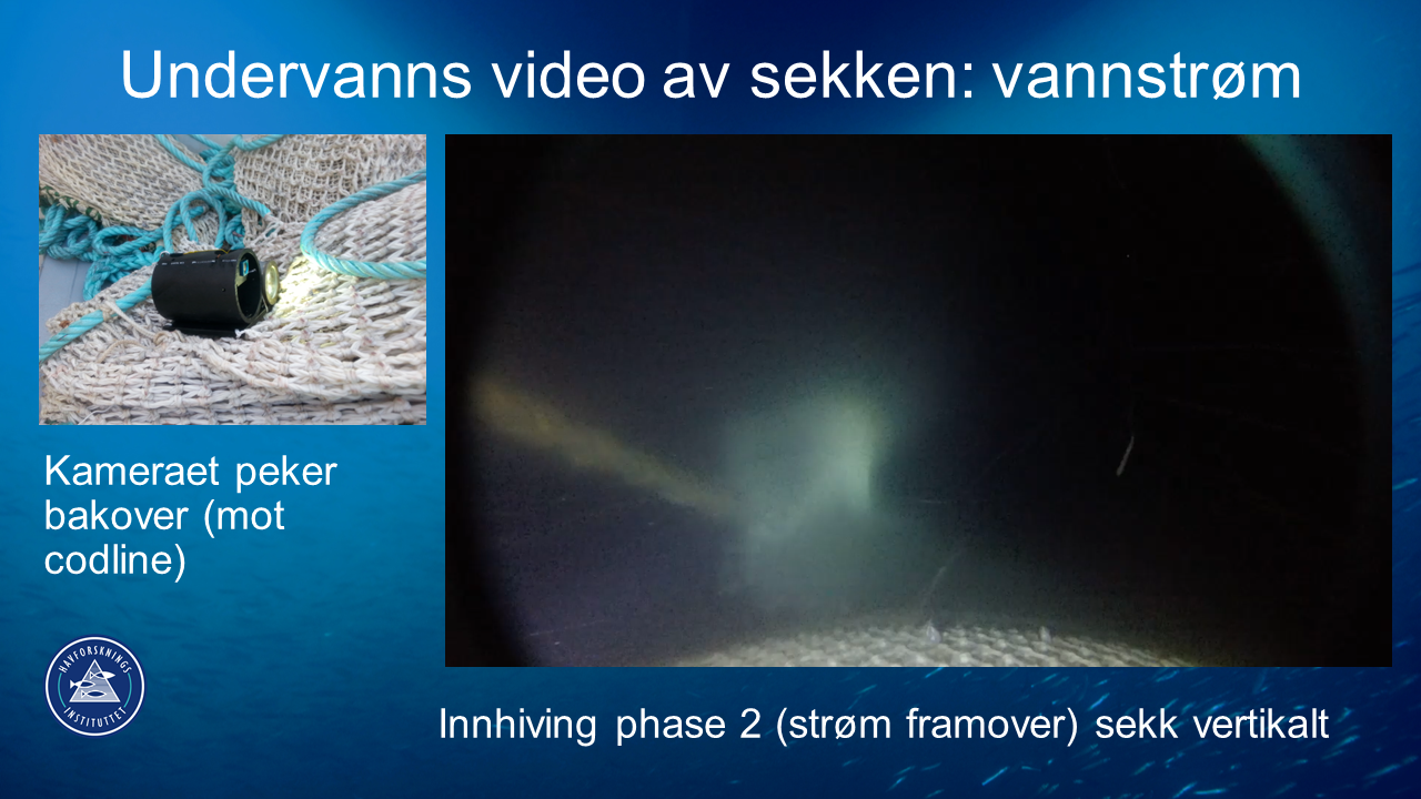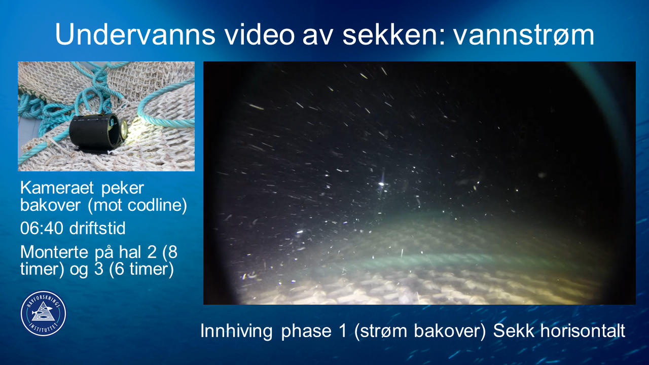 Opptak fra undervannskamera montert i taket av sekken viste at vannstrømmen er bakoverrettet fram til oppstigningshastigheten øker vesentlig etter at sekken er kommet opp på 206 m dyp (Figur 6 a.). Deretter strømmer vannet framover (Figur 6 b.), noe som indikere at (enden av) sekken blir stående på skrå eller vertikalt og skyver vann framfor seg under innhiving, samtidig som den trekker resten av trålens bakre del mot overflaten. Dette resultatet stemmer overens med Tabell 1 og Figur 2. Luftbobler blir tydelige fra 155 m og oppover og indikerer at svømmeblærer blir punkterte slik at fisk slipper ut luft (Figur 7).