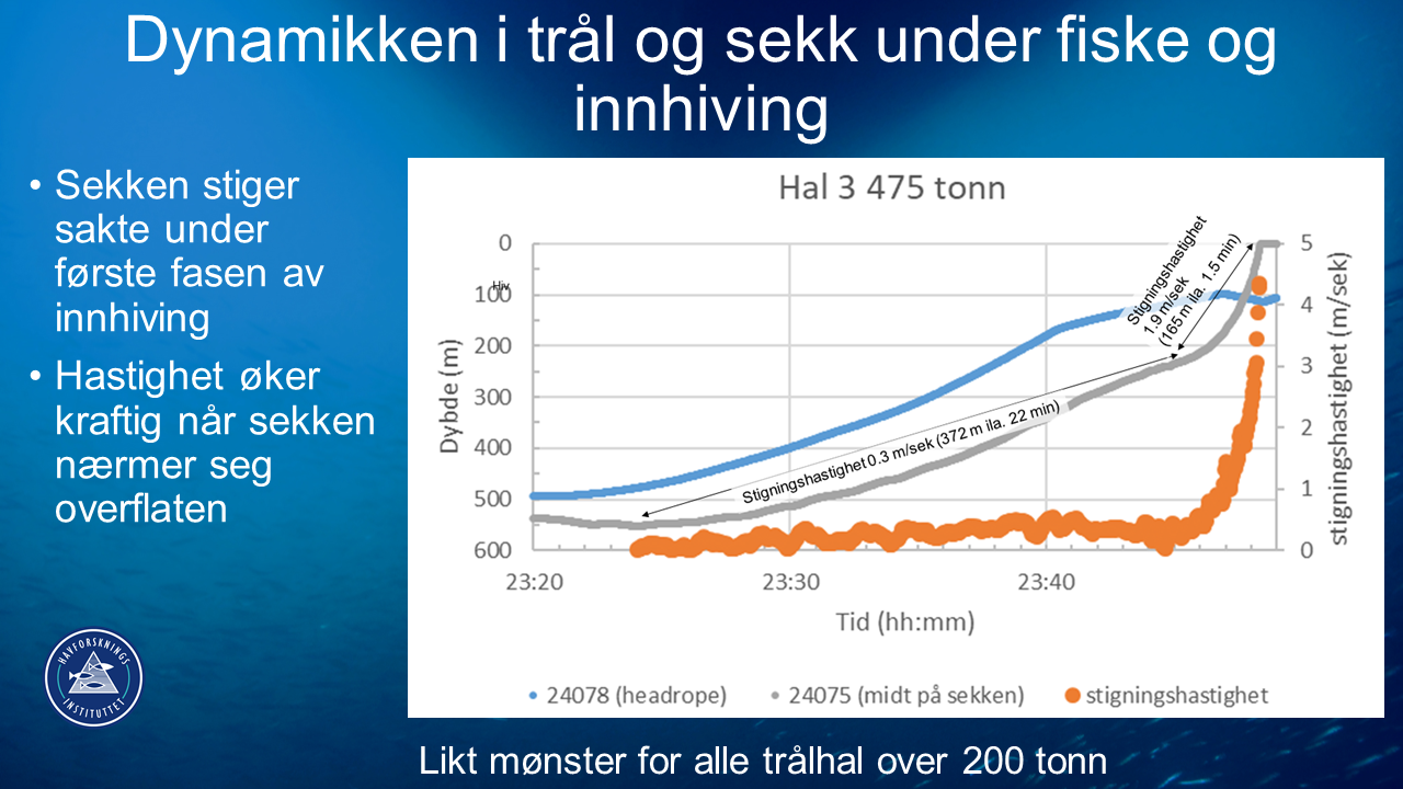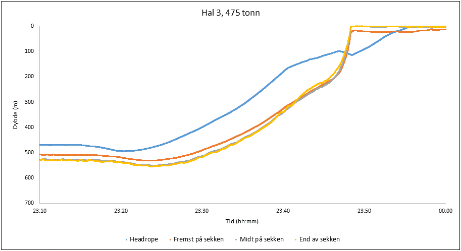 Under fiske og tidlig i innhivingen var sensorene monterte på midten og enden av sekk dypere enn sensoren på headlina og sensoren fremst på sekken i alle de observerte halene men etter hvert passerer sensoren på enden av sekken alle de andre, slik at enden av sekken alltid kommer alltid først til overflaten (Figur 4).