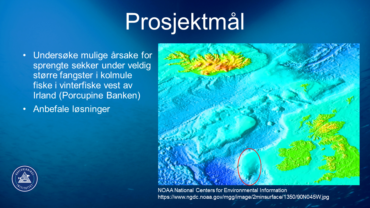 Prosjektet ble satt i gang etter et møte i desember 2017 mellom FHF, Havforskningsinstituttet, redere og en leverandør av marinteknologi. Under møtet ble sprenging av sekker i kolmulefiske, særlig i ‘Porcupinebank’ området vest for Irland, diskutert som et uønsket økonomisk tap for rederne (mistet fangst og redskap), sløsing med ressurser og utilsiktet dødelighet av kolmule. Prosjektets målsetting var å delta på 1-2 kommersielle tokt og samle inn data på en systematisk måte om sannsynlige grunner til sprenging av kolmulesekker. Finansering og gjennomføring ble utført som et samarbeidsprosjekt og spleiselag mellom Havforskningsinstituttet, Fiskeridirektoratet og Fiskeri- og havbruksnæringens forskningsfinansiering.