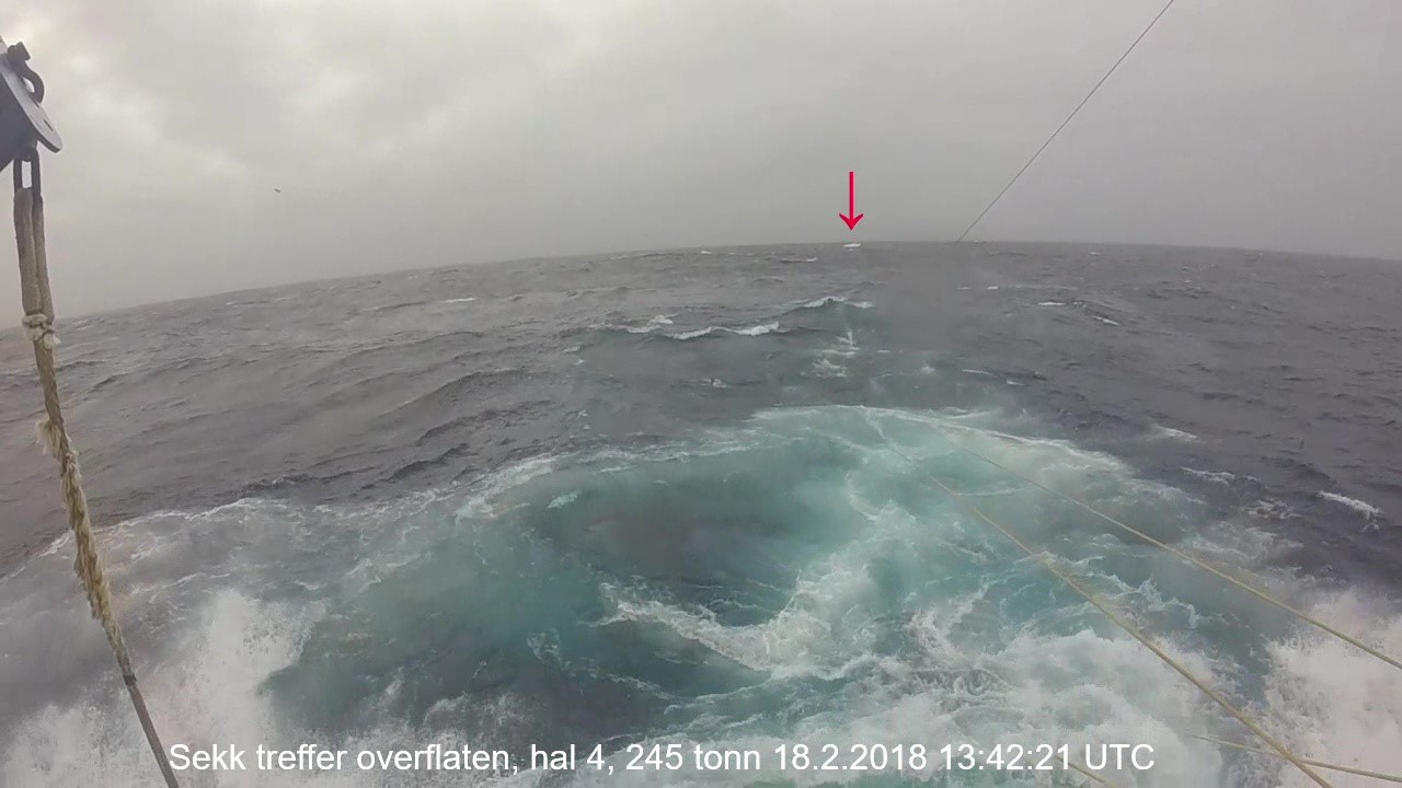 Videoopptak bekreftet resultatene fra dybdesensorene. Opptak fra fartøyet viser at sekken treffer overflaten med stor kraft sel selv med relativt liten fangst på under 250 tonn (Figur 5).