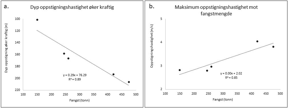 Det var indikasjoner på en sammenheng mellom dypet hvor oppstigningshastigheten øker kraftig og fangstmengde (Figur 3a.). Jo større fangst dess større er dypet der oppstigningshastighet begynner å øke (R2 = 0.89). Likeledes, jo større fangst, dess høyere maksimal oppstigningshastighet (R2 = 0.85, Figur 3b).