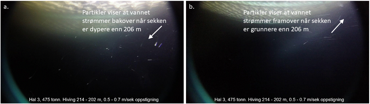 Figur 6. Video opptak viser at vannstrømmen er bakoverrettet under innhiving fram til 206 m dybde (a., venstre), og framoverrettet fra 206 m til overflaten (b., høyre).Figur 7. Videokamera montert på sekk viser at fisk slipper ut luft på 155 m dyp