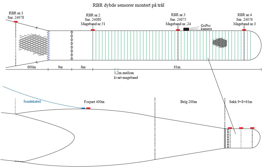 Figur 1. Plassering av RBR dybdesensorer og GoPro video kamera på trålen og på sekken. Tegningen er ikke i målestokk.
