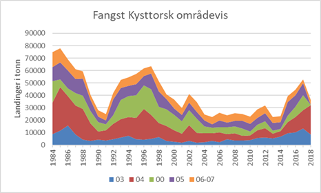 Figur 2. Beregnet fangstkvantum av kysttorsk per statistisk område nord for Stad (62 ˚ N) i 1984-2017 (2018) basert på stikkprøver av øresteiner fra fangstene. Merk at fangstene i område 04, 05 og 00 er slått sammen i 2018 (rustrød farge).
