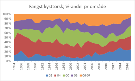 Ved Havforskningsinstituttet blir torsk sortert til kysttorsk og skrei basert på mønsteret i vekstsonene i ørestenene (otolittene) (Rollefsen 1933). Ut fra ørestensprøver er fangstkvantum av kysttorsk beregnet for årene 1984-2018 (Figur 2). Reviderte beregningsrutiner er årsak til at 2018 ikke er like godt fordelt på områder. Det bør utvikles rapporter i programvaren «Estimating Catch-at-age» (ECA) som kan presentere estimerte kysttorskfangster per område, kvartal og redskap.