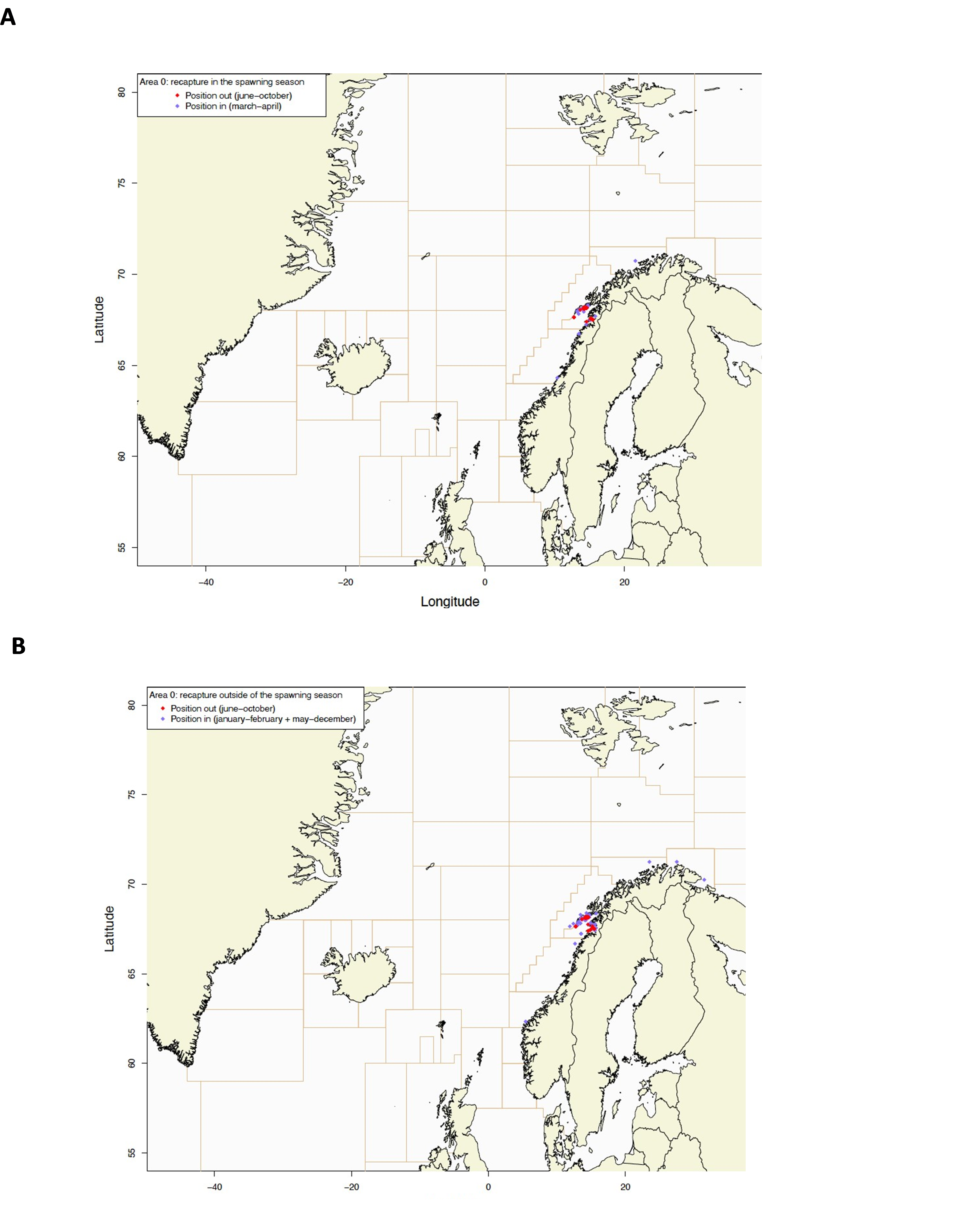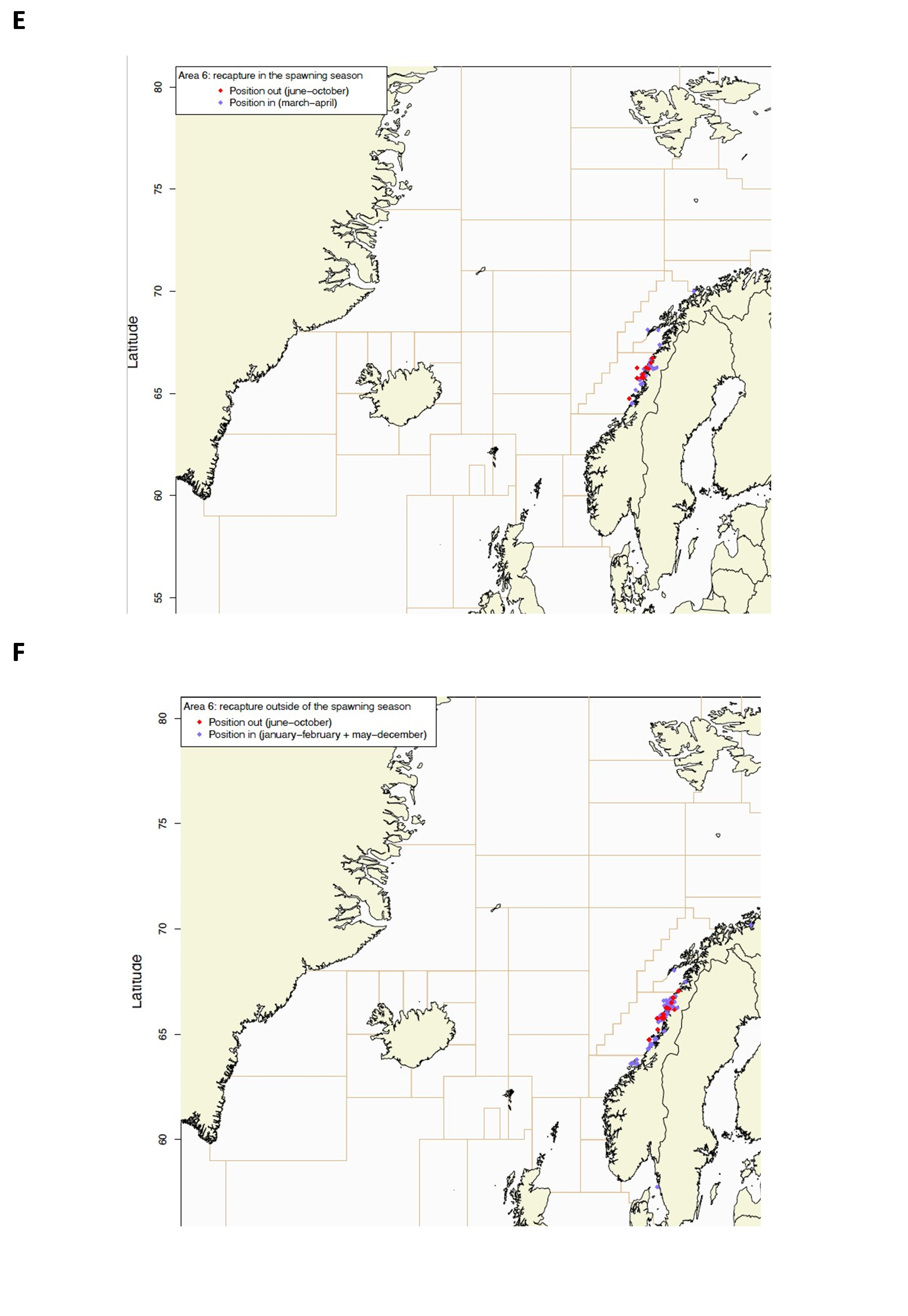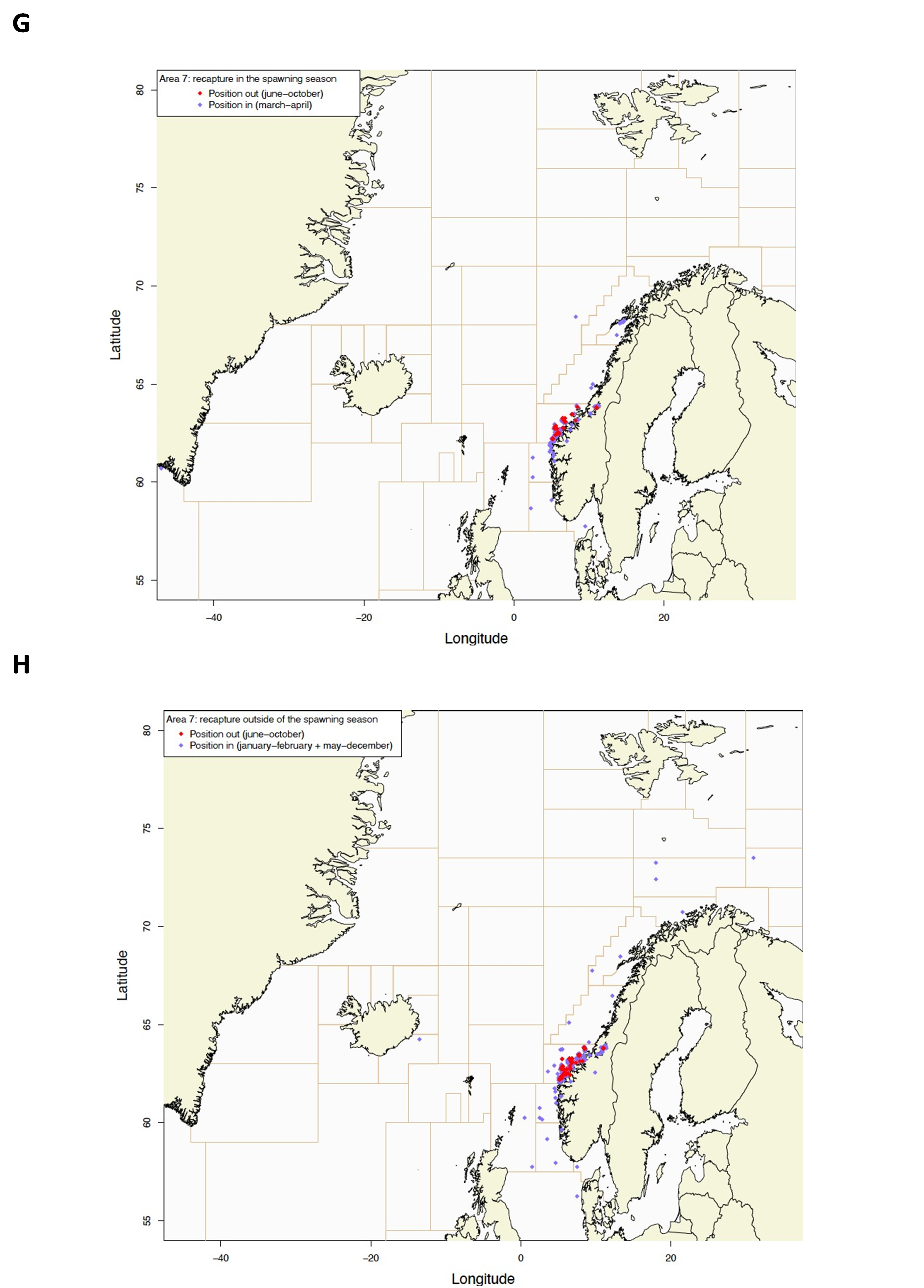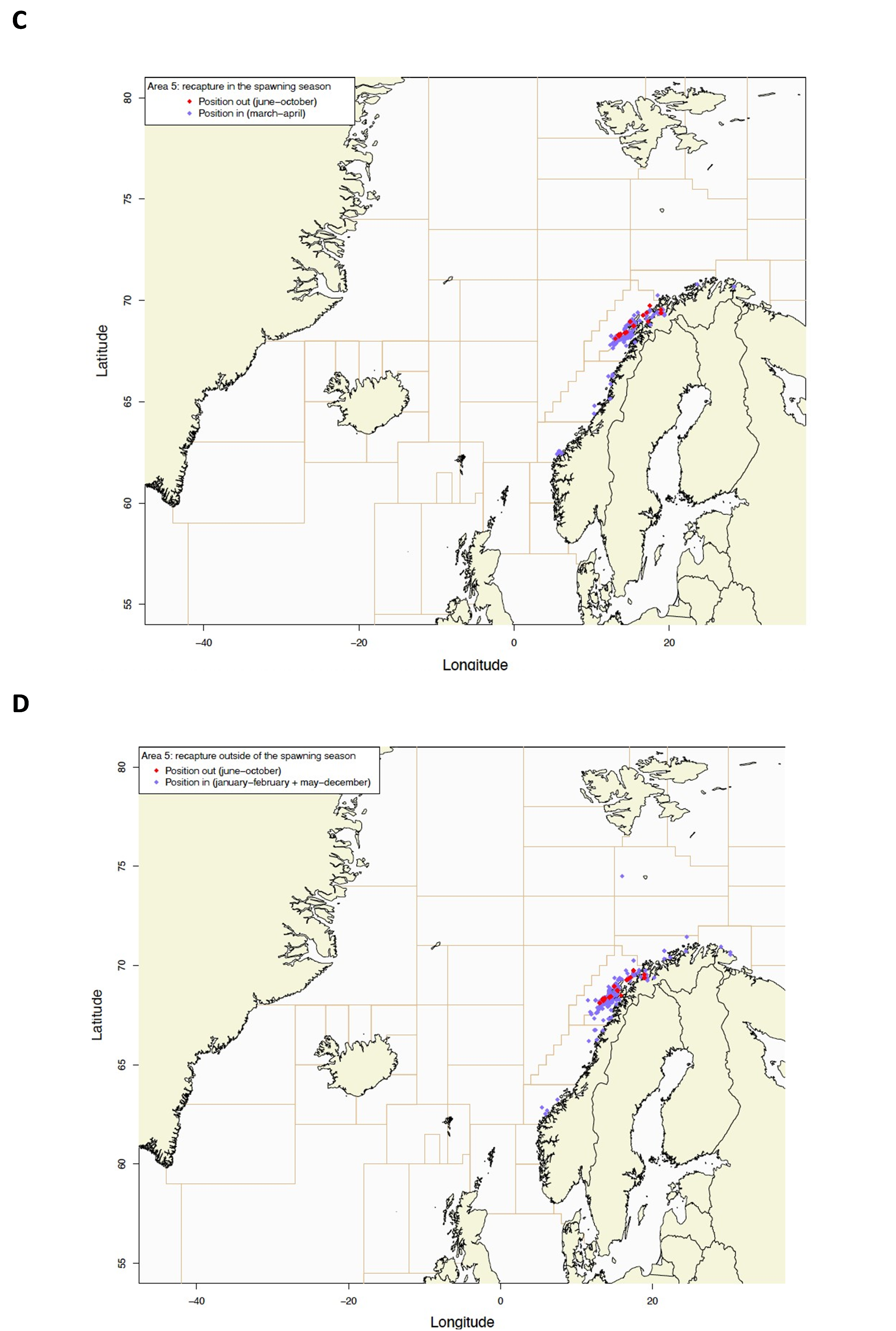 Utsettingslokalitet og gjenfangststed er plottet i Figur 2, fordelt på gjenfangster i gytesesong (mars-april) og utenom gytesesong (resten av året).