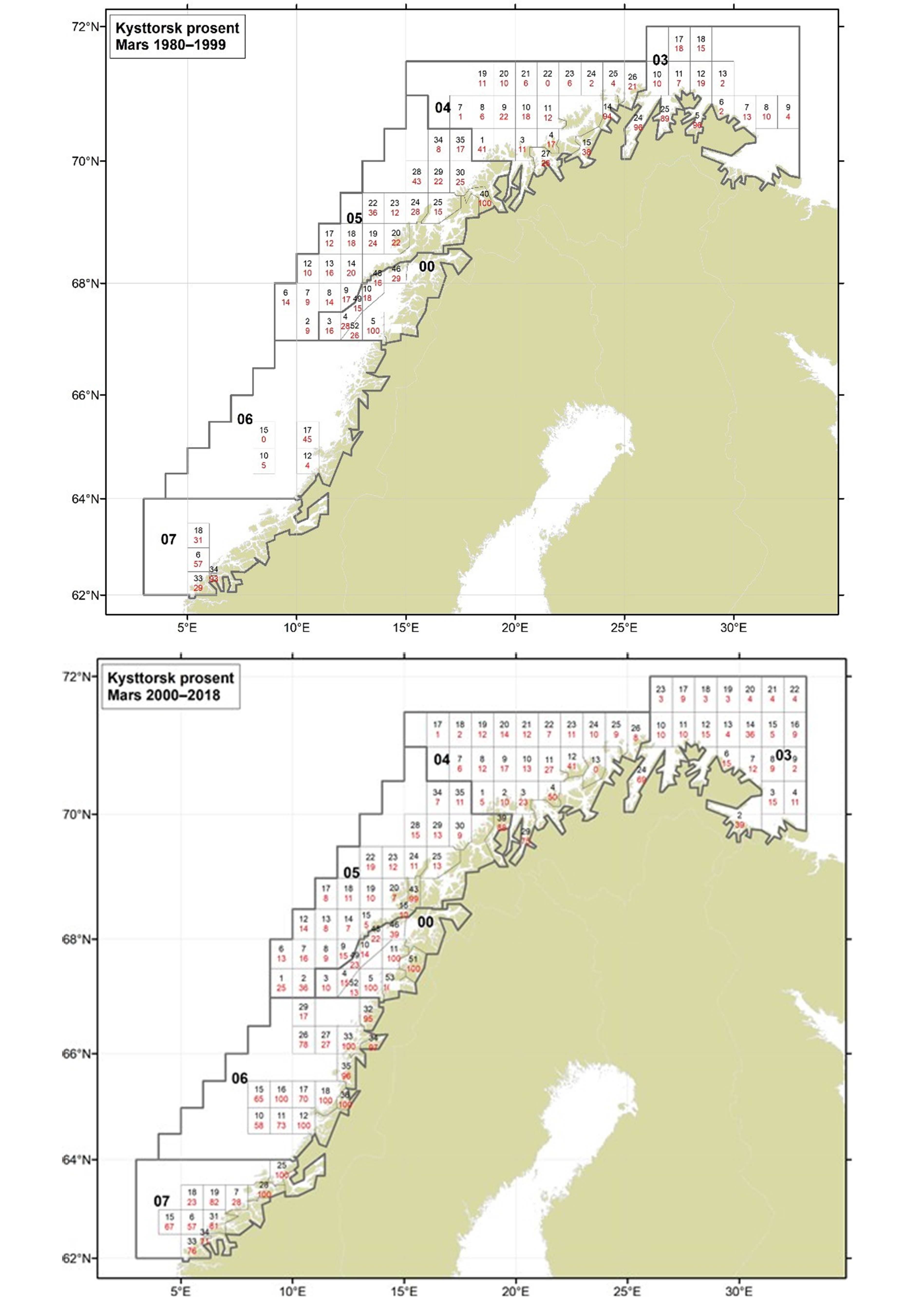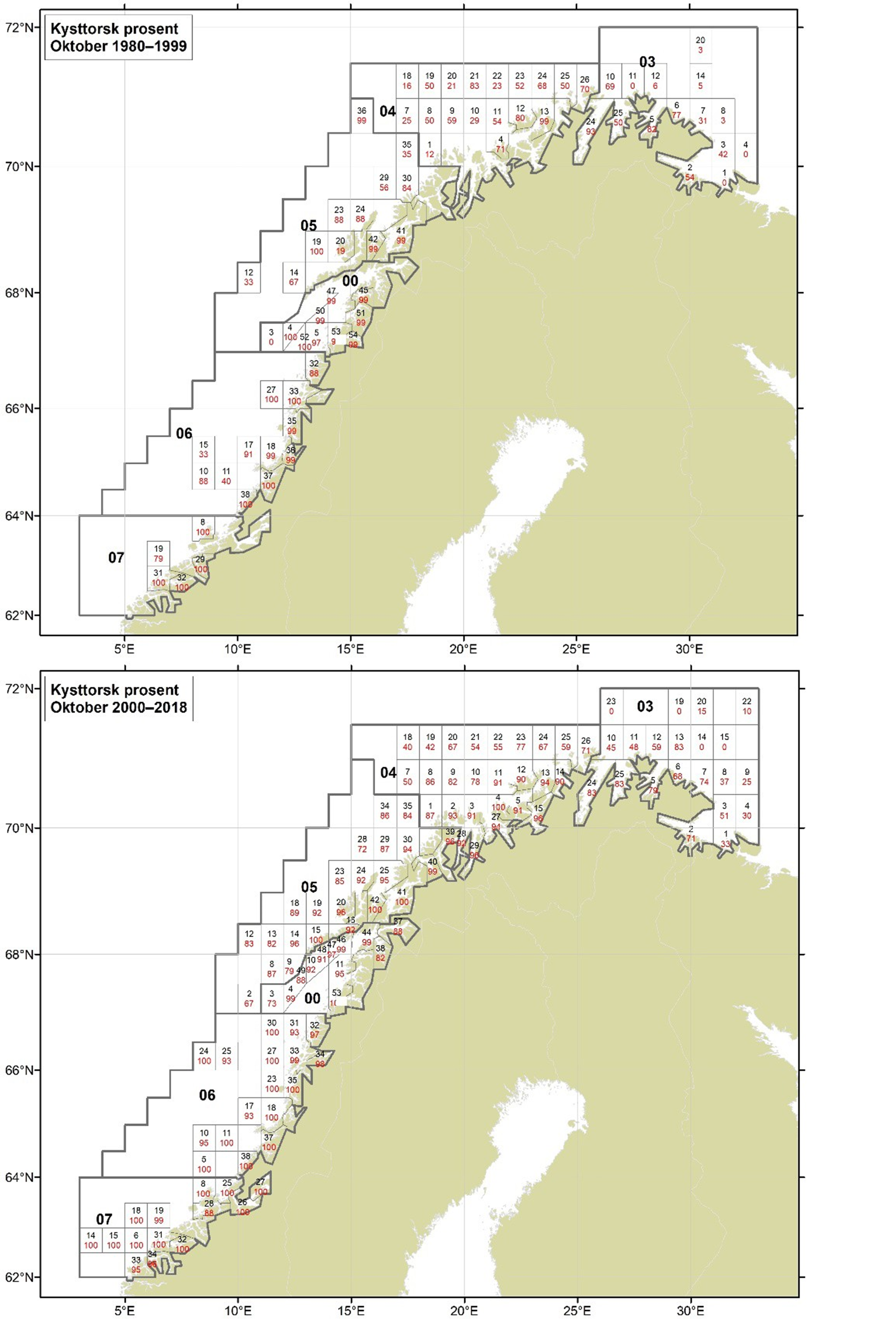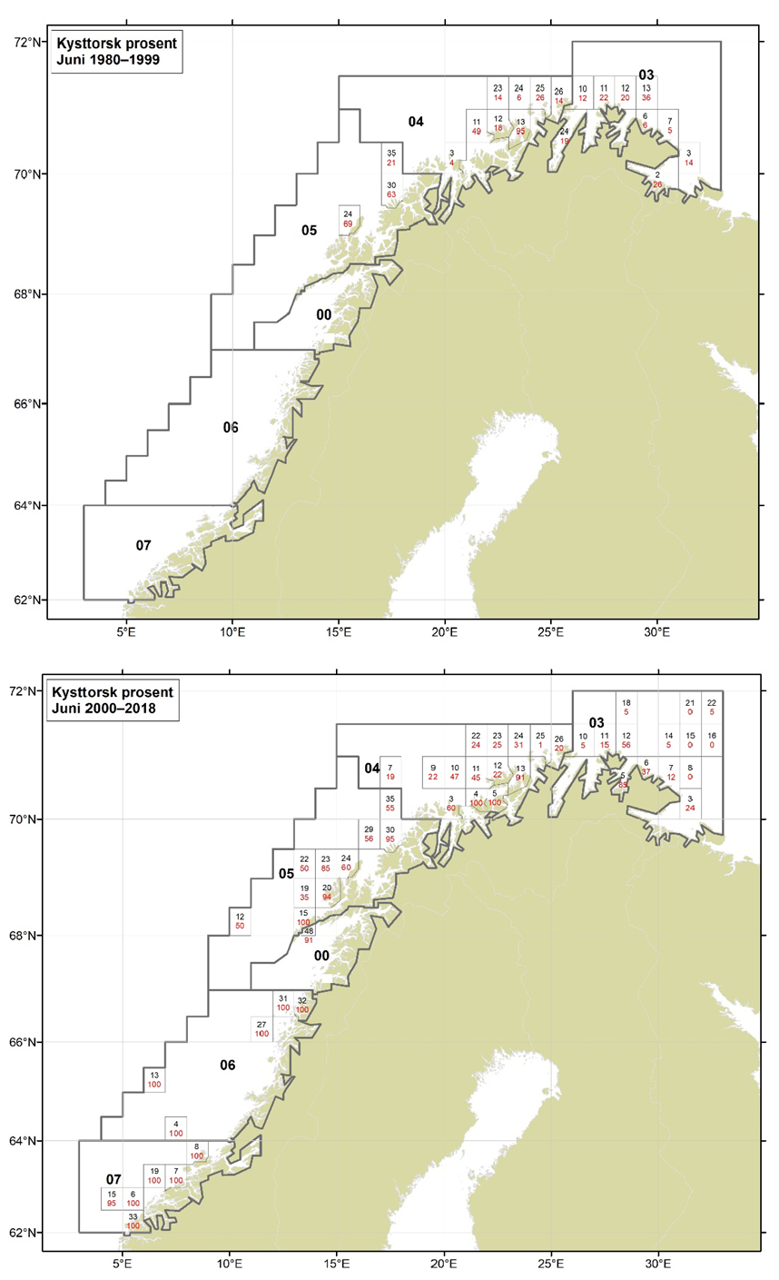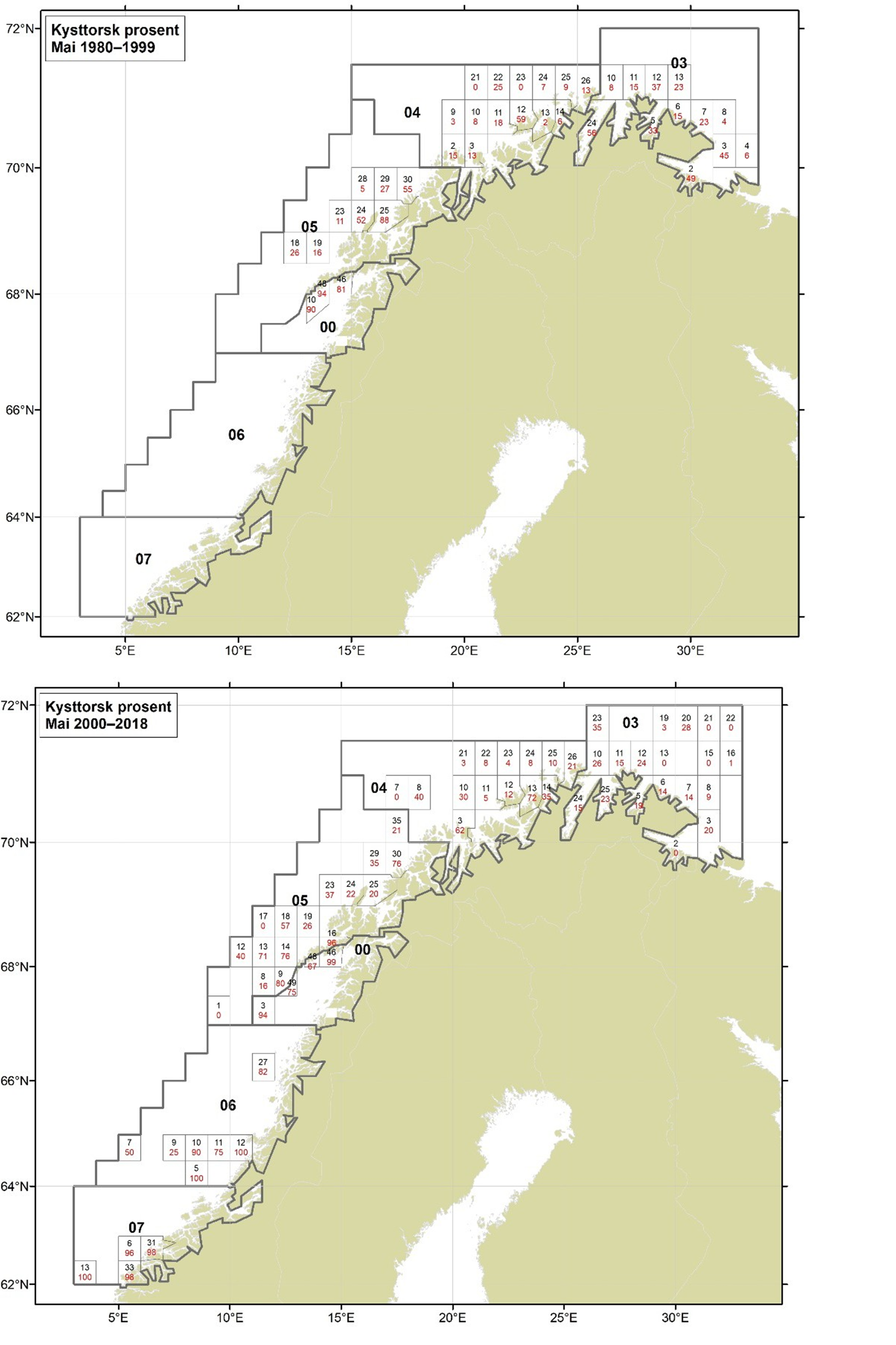 Figurer i Vedlegg 3 viser kart over prosent kysttorsk, bestemt utfra otolittmønster, per lokalitet innenfor alle kystområdene nord for 62N (03, 04, 05, 00, 06 og 07) hver måned i to tidsperioder 1980-1999 og 2000-2018. Kartene inkluderer prøvetaking både fra fiskeriene og fra forskningstoktene. Kartene viser at den geografiske prøvedekningen har blitt bedre i perioden 2000-2018 sammenlignet med 1980-1999. Vi ser også tydelige sesongmessige variasjoner. Det er disse data som benyttes ved estimering av kysttorskfangstene (se kapittel Landingsdata og forvaltningshistorikk).