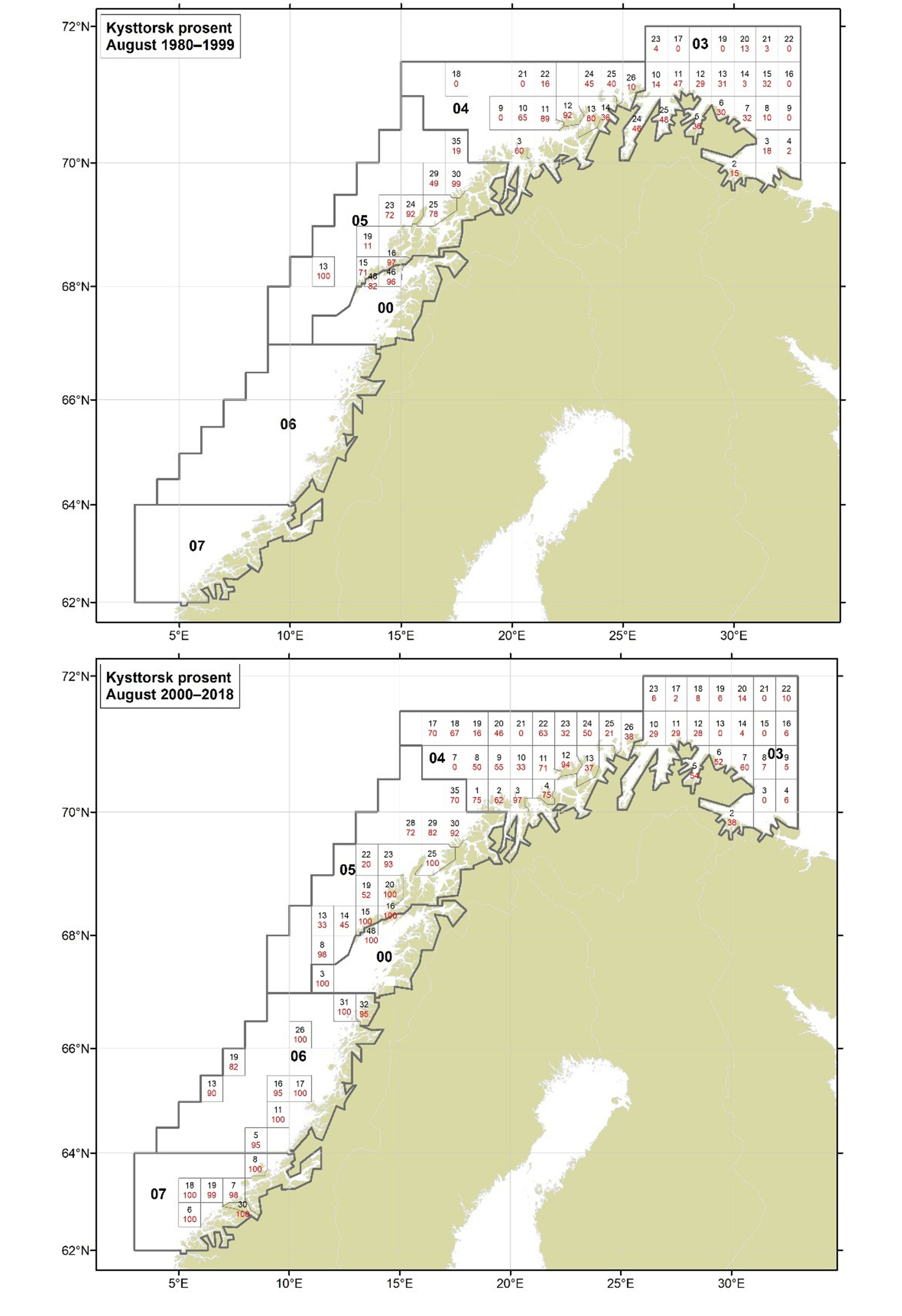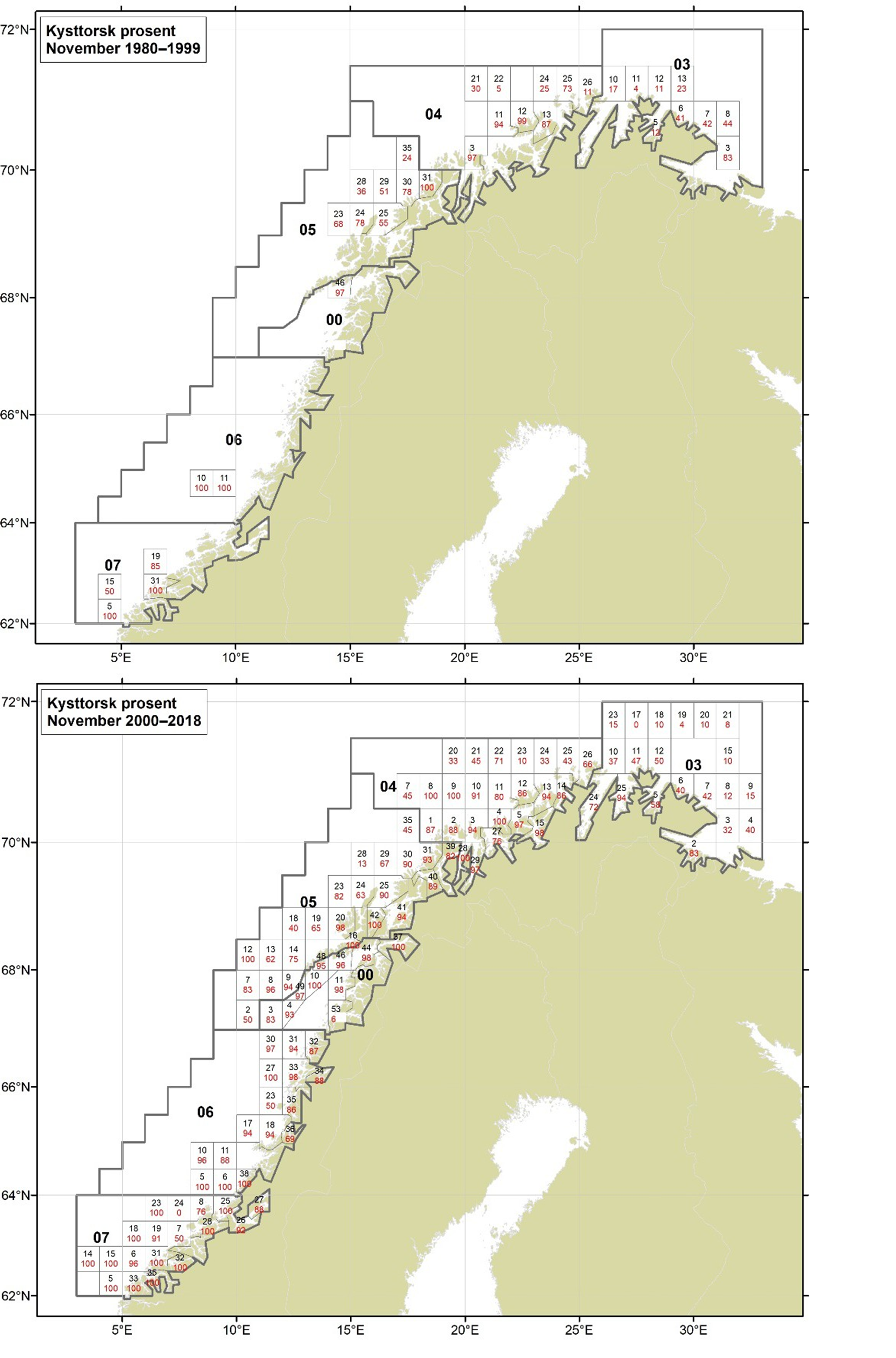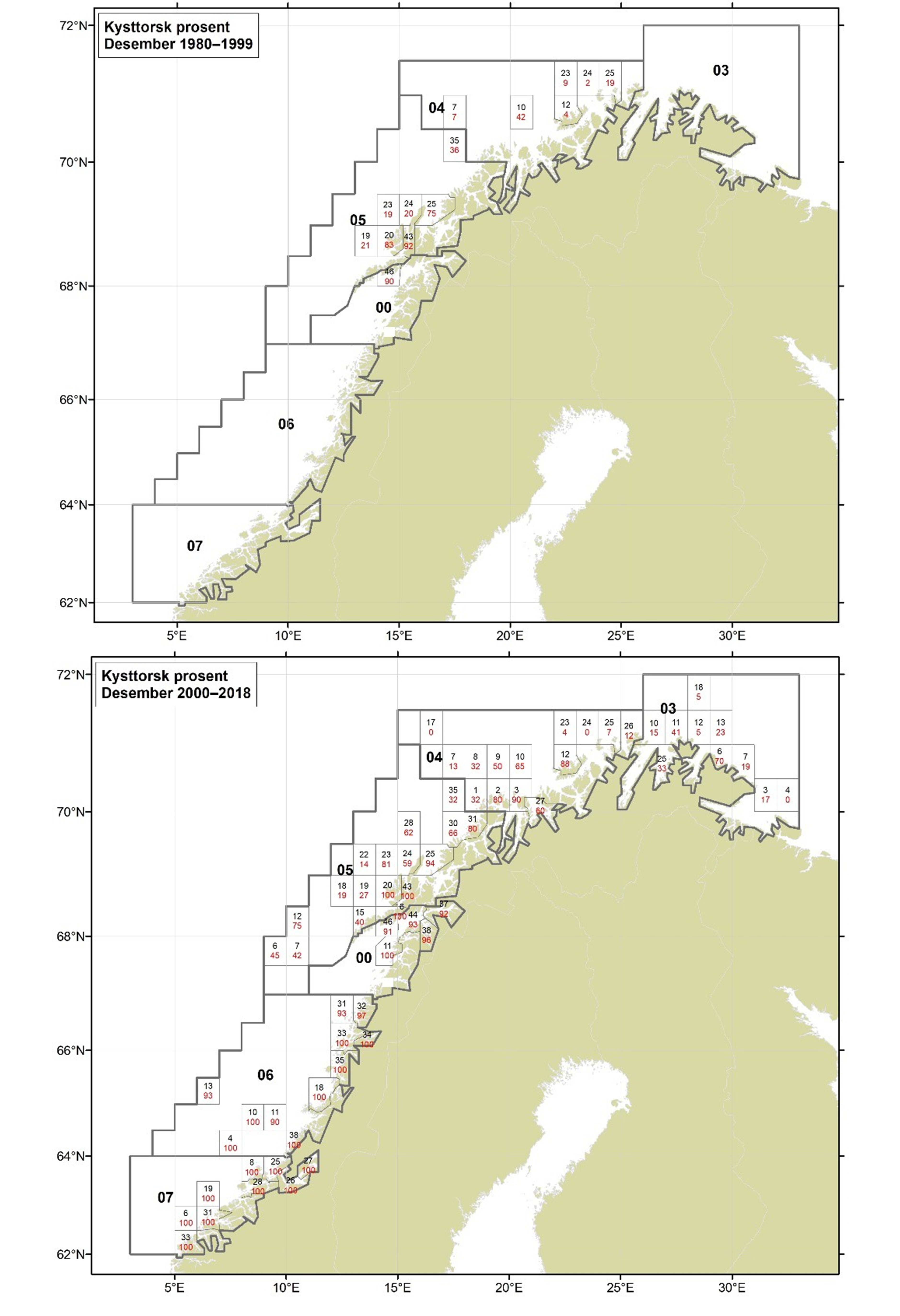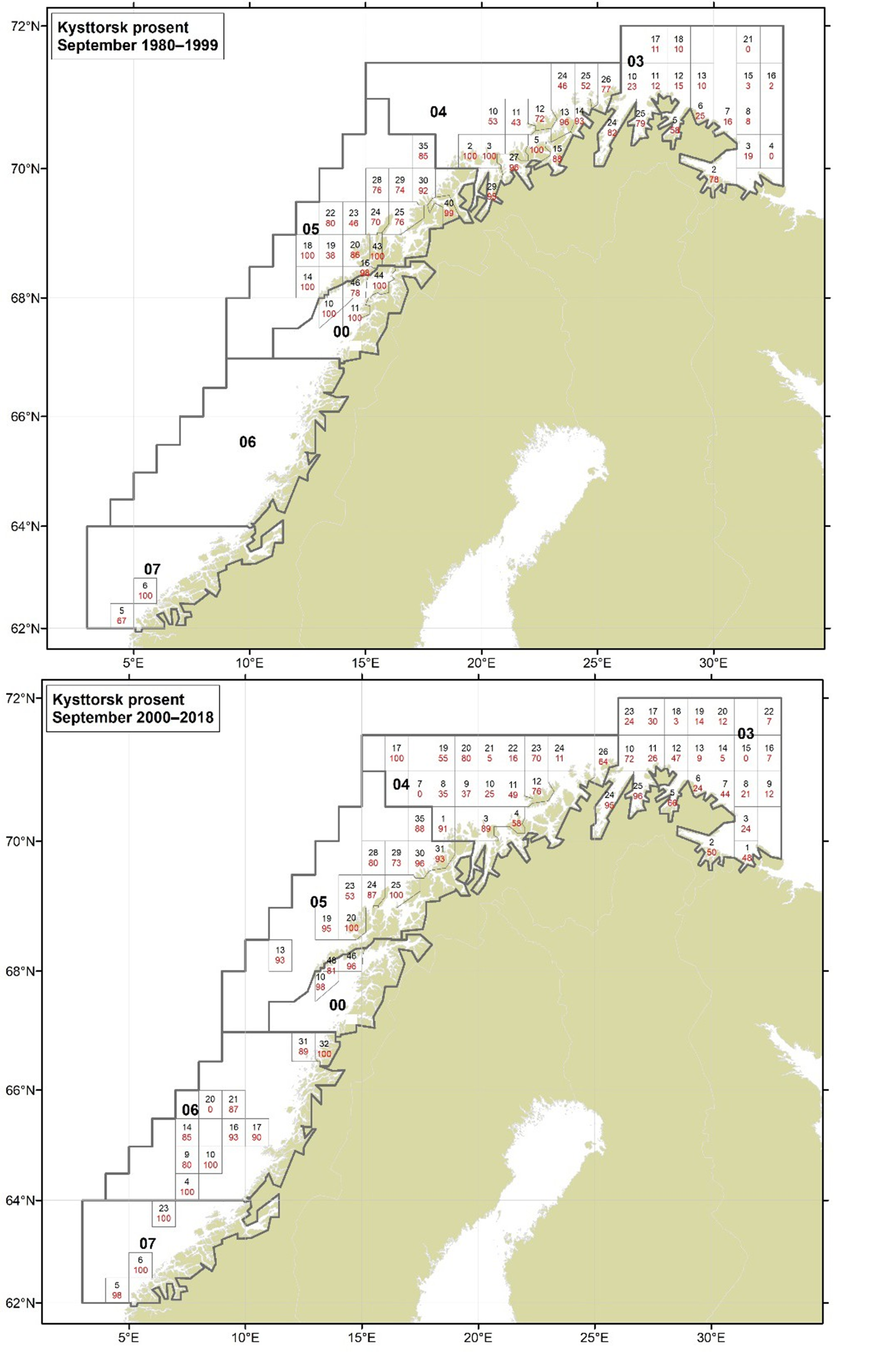 Figurer i Vedlegg 3 viser kart over prosent kysttorsk, bestemt utfra otolittmønster, per lokalitet innenfor alle kystområdene nord for 62N (03, 04, 05, 00, 06 og 07) hver måned i to tidsperioder 1980-1999 og 2000-2018. Kartene inkluderer prøvetaking både fra fiskeriene og fra forskningstoktene. Kartene viser at den geografiske prøvedekningen har blitt bedre i perioden 2000-2018 sammenlignet med 1980-1999. Vi ser også tydelige sesongmessige variasjoner. Det er disse data som benyttes ved estimering av kysttorskfangstene (se kapittel Landingsdata og forvaltningshistorikk).