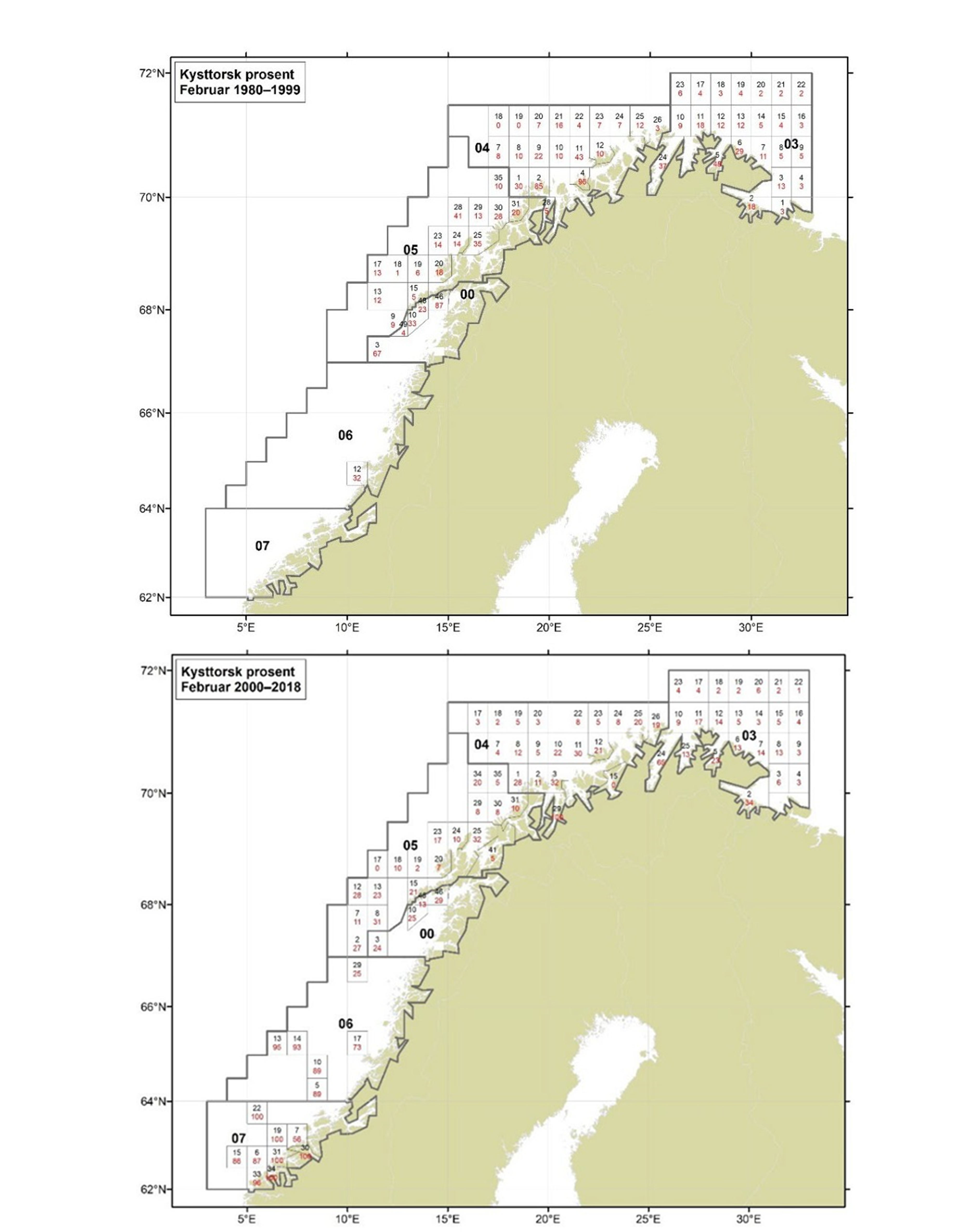 Månedsvis prosent kysttorsk (basert på otolittmønster, angitt med røde tall) per fangststatistikk-lokasjon (angitt med svarte tall) per måned, for perioden 1980-1999, og for perioden 2000-2018. Inneholder data fra både forskningstokt og fra prøvetaking av fiskeriene.