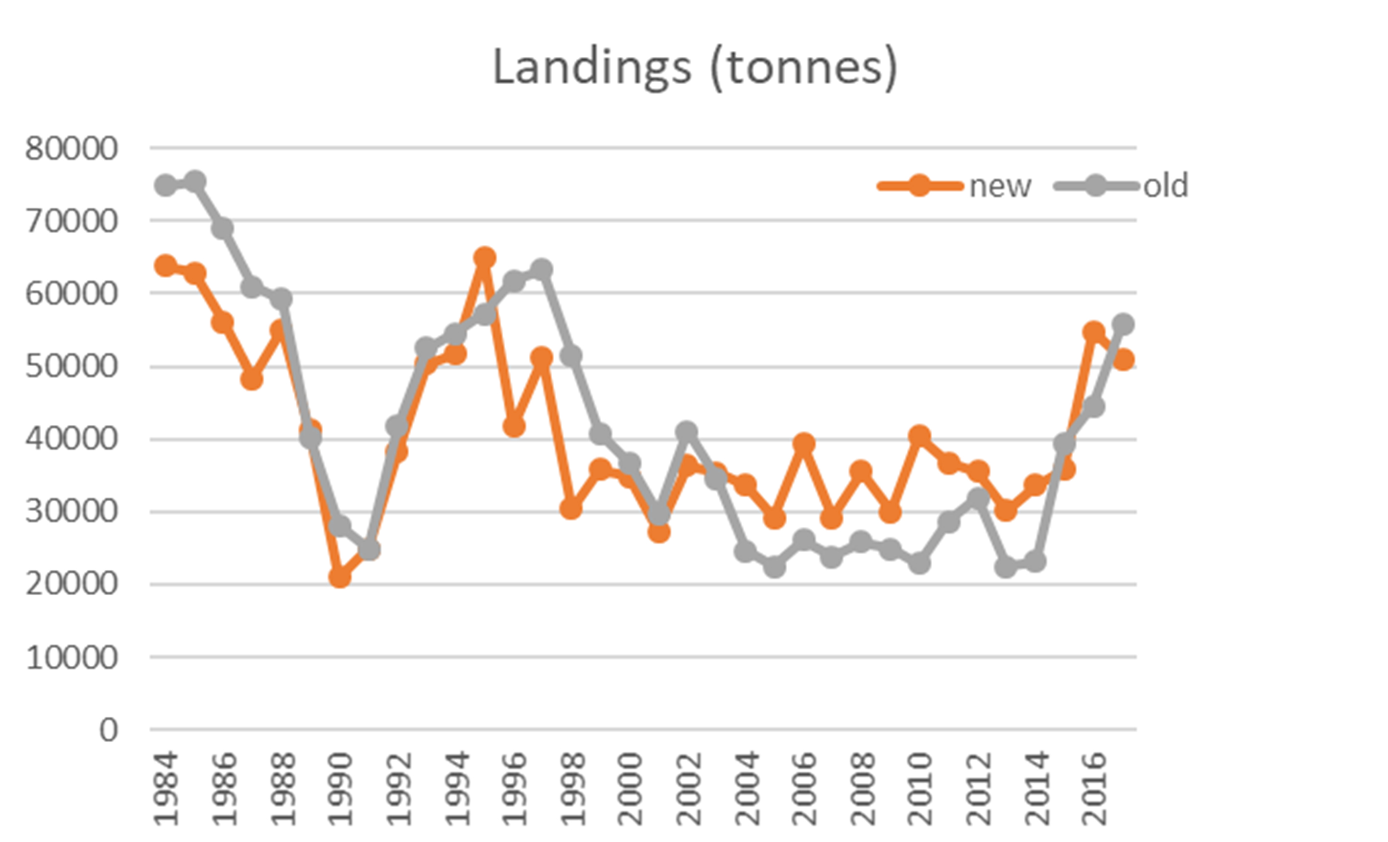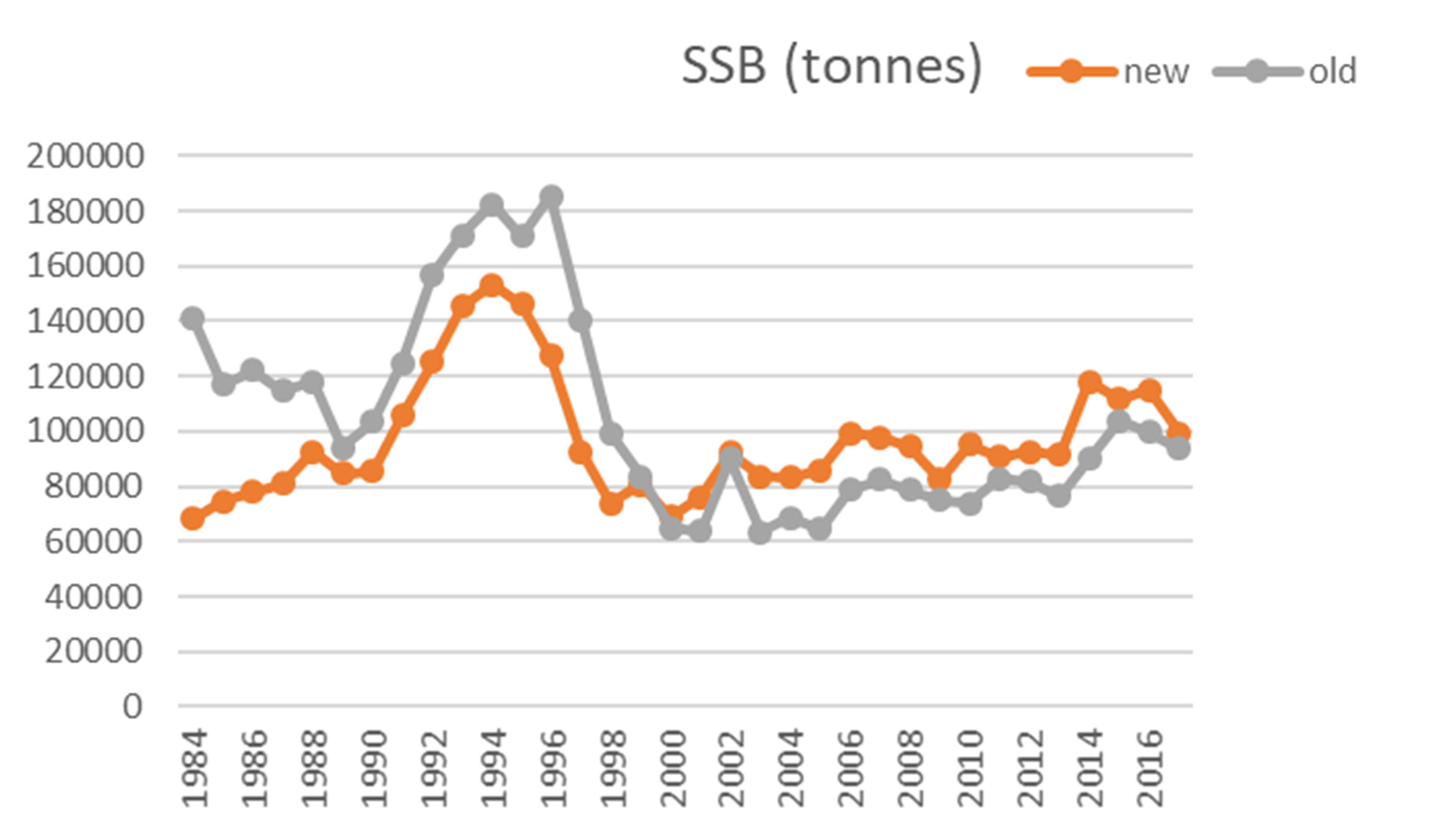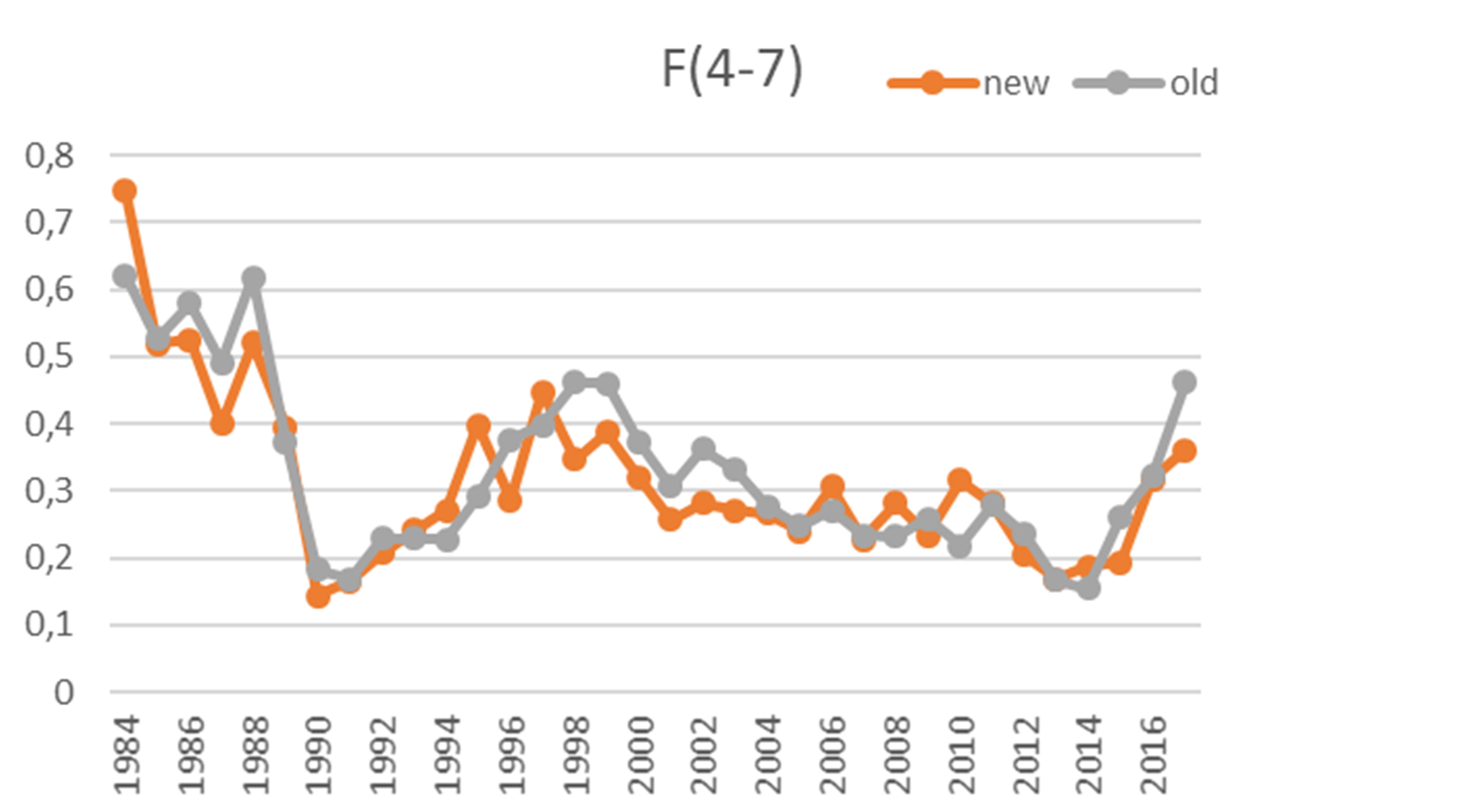 En bestandsberegning (vpa) basert på denne fangst-serien (Figur 5) tilsier at bestanden var på sitt laveste i de første 4 årene av tidsserien (1984-1987), mens beregningen med den gamle fangst-serien viser en bestand som i de 4 første årene var i overkant av langtids-gjennomsnittet. Den nye beregningen bekrefter at bestanden var på sitt høyeste rundt 1994, men forskjellen mellom dagens bestand og høyest observert bestand er litt mindre.