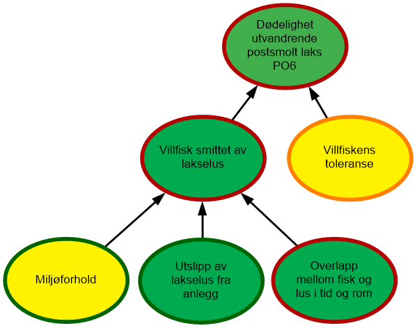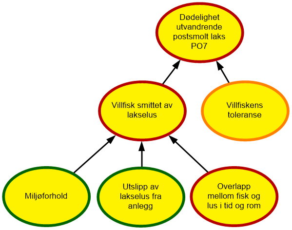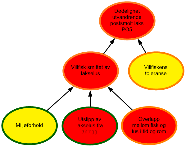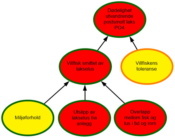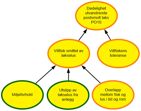 Risiko for dødelighet på utvandrende postsmolt av laks, avhenger hovedsakelig av i hvilken grad villfisk smittes av lakselus og villfiskens toleranse for lakselus (figur 3.1).
