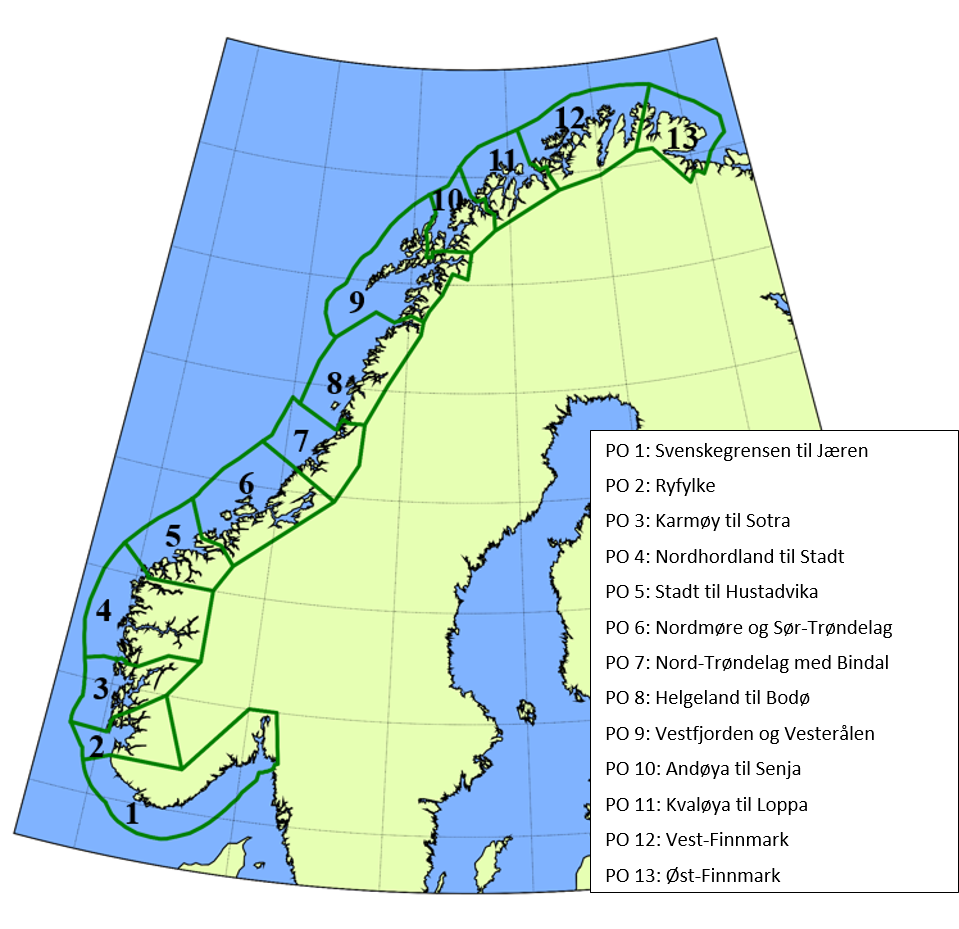 Den geografiske avgrensingen av de 13 produksjonsområdene fra Svenskegrensen til Øst-Finnmark (PO1 – 13).