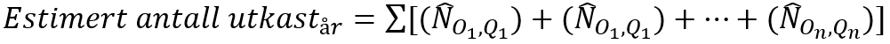 Gjennomsnittlig antall utkast per sluttseddel ble estimert for hvert stratum. Denne verdien ble multiplisert med den totale innsatsen i den aktuelle perioden/området i form av totalt antall sluttsedler. For strata som manglet dekning av registrerte fisketurer (< 2) ble det etablert en «donor-regel». Dette innebærer at strata uten data bruker data fra et naboliggende statistikkområde. Vi antar at variasjonene i utkast i fisket er større mellom ulike kvartal av året, enn mellom naboliggende statistikkområder. Data fra samme kvartal, men et annet statistikkområde ble derfor prioritert. Data fra naboliggende områder (beskrevet i tabell 2.1) ble brukt til å beregne et estimat av gjennomsnittlig antall utkast per sluttseddel, som deretter ble multiplisert med totalt antall sluttsedler med torsk fra det originale stratumet.